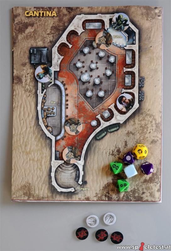 Ausstattung:Die rund A4 große und zirka fünf Zentimeter hohe Schachtel aus recht dünnem Karton enthält einen Einführungsbogen, das Abenteuerheft, vier Charakterbögen, Pläne, diverse Marker aus dickem Karton, die 14 Spielwürfel und ein Regelheft. Weiters bietet Heidelberger Spieleverlag auf seiner Homepage noch Links zum kostenfreien Download zweier zusätzlicher Charaktere und ein weiteres Abenteuer an. Der vierseitige Einführungsbogen erklärt was ein Rollenspiel ist und gibt ein Beispiel einer Situation des folgenden Abenteuers. Als nächstes kann man schon mit dem 32 seitigem Abenteuerheft beginnen und das Spiel geht los. Für einen erfolgreichen Spieleabend ist allerdings anzuraten, dass der Spielleiter sich das Abenteuerheft zuvor durchliest, dann sollte das eigentliche Spiel ohne nennenswerte Pausen ablaufen können. Das Abenteuerheft bietet ein recht lineares Abenteuer, das von Begegnung zu Begegnung weitere Regeln vorstellt, bestehende vertieft und so die Spieler langsam und sanft von einfachen Fertigkeitsproben über Kampf bis hin zu Charaktersteigerung und Raumkampf geleitet. Die Hefte sind sehr übersichtlich gestaltet, mit klarem Schriftbild, farblich markierten Kästen und einer Menge Illustrationen, die viel der Atmosphäre von Episode IV bis VI übermitteln. Irgendwie fühlt man sich fast an das Tutorial eines Videospiels erinnert. Dem Spielleiter werden nicht nur genaue Anweisungen über Regeln und Abfolgen gegeben, er bekommt auch eine Menge Hinweise, wie er auf verschiedene Aktionen der Spieler reagieren und wie er fehlgeleitete Spielergruppen wieder näher an den Handlungsstrang bringen kann. Auf den vier Charakterbögen finden sich ein menschlicher Schmuggler, eine Twi´lek Kopfgeldjägerin, ein Wookie-Söldner und ein Droidenkolonist. Die Eigenschaften, Fertigkeiten und Talente sind passend ausgesucht, neben dem eigentlichen Bogen finden sich Hilfen zu den Proben und Erklärungen zu den Talenten. Auf der zweiten Doppelseite findet sich ein weiterer Bogen, der nach der ersten Steigerung verwendet werden kann. Die letzten beiden Seiten zeigen den passenden Talentbaum und die Hintergrundgeschichte des Charakters. Die Würfel stellen wie bei fast allen Rollenspielen das zentrale Spielelement dar: