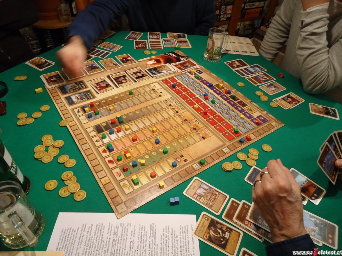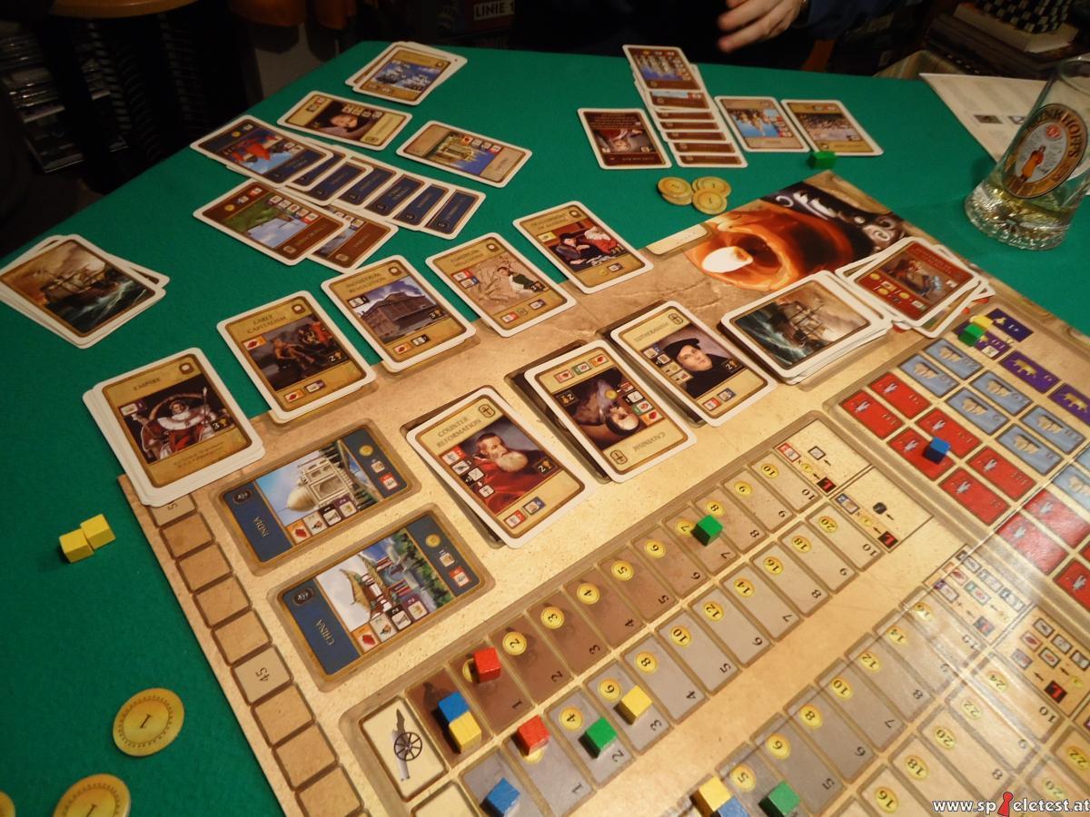 Entwicklungs- und Aufbauspiele mochte ich schon immer, diese werden auch oft Zivilisationsspiele genannt, stehen doch häufig oder sogar meist ganze Zivilisationen auf dem Spiel bzw. zur Disposition. Unvergessen und auch heute noch gut: Civilization von Sid Meier, wie könnte der Titel auch anders sein? In seiner Ur-Version von Avalon Hill Urvater aller solcher Spiele. Doch genau wie Zivilisationen entwickeln sich auch Spiele weiter, und mittlerweile gibt es jede Menge dieses Genres, mal mehr, mal weniger gute. Gerade in letzter Zeit erstaunlich viele gute, meine ich, und eine Entdeckung der SPIEL ’14 ist „Imperialism – Road to Domination“ des polnischen Autors Konrad Perzyna. Der große Spielplan dient eher mehr noch als bei ähnlichen Spielen der Verwaltung, ist trotzdem grafisch sehr ansprechend, ebenso wie die vielen Karten. Geldplättchen und Holzmarker komplettieren die für ein Spiel dieser Art eher magere Ausstattung – „mager“ nicht im Sinne von „schlecht“, sondern „übersichtlich“. Auch die englische Regel ist erstaunlich kurz und überschaubar – zudem noch gut, und das will was heißen, wenn ich das sage. Im Internet ist auch die deutsche Übersetzung zu finden, die auch recht brauchbar wirkt. Wie der Titel schon vermuten lässt, geht es hier um die Zeit des Imperialismus – die europäischen Großmächte entdecken und erobern die Welt. Das Spiel ist genau genommen ein Kartenspiel, gepaart mit Warenwirtschaftselementen. Karten haben wir in drei Hauptkategorien: Gebietskarten und Errungenschaftskarten, die jeweils in bestimmter Anzahl offen ausliegen, und einen verdeckten Stapel Schicksalskarten, so will ich sie mal nennen. Ach, ein paar Religionskarten gibt es auch noch, nur drei verschiedene je zweimal, die offen auf dem Spielplan liegen. Viele Zählleisten mit diversen Waren, je eine Doppel-Leiste für Land- und Seemachtstärke und eine Leiste für Prestigepunkte vervollständigen den Spielplan. Last not least sind dort fünf Aktionsfelder zu finden, umrahmt ist das Ganze mit der Kramerleiste für die Sieg-, pardon, Ruhmespunkte. Der Ablauf ist generell recht einfach. Wer an der Reihe ist, kann Handkarten abwerfen, füllt dann aus offener und/oder verdeckter Auslage auf bzw. wirft bis auf sein Limit ab. Perfekt und pfiffig ist geregelt, von wo man nachzieht, die einfachen Einzelheiten seien der Regel vorbehalten. Anschließend führt der Spieler eine Aktion aus und muss dazu seinen Marker auf der Aktionsleiste beliebig versetzen. Das bedeutet, dass niemand zweimal nacheinander dieselbe Aktion ausführen kann. Meist hüpfen die Spieler mit ihrem Marker zwischen Eroberung und Entwicklung hin und her, aber insgesamt sind die Aktionen allesamt so einfach, dass ich sie ruhig hier aufführen kann. Eroberung – man legt eine seiner Gebietskarten aus, Land oder Kolonie, zahlt die angegebenen Kosten, falls die aufgeführten Bedingungen erfüllt sind, z. B. bestimmte Landmachtstärke, und profitiert von den Vorteilen, meist Vorrücken auf einigen Warenleisten und/oder der Militärstärkeleiste, auch Ruhmes- oder Prestigepunkte sind hier zu gewinnen. Entwicklung – der Begriff ist etwas unglücklich gewählt, denn Anfänger tendieren dazu, ihren Warenmarker vorzuschieben, was aber nur durch Karten geschieht. Tatsächlich findet ein „virtueller“ Handel statt, d. h., der Spieler erhält je nach eigener Warenmenge eine bestimmte Geldsumme, kann außerdem einen bestimmten Vorteil nutzen, beispielsweise Land- oder Seestreitkraft kaufen. Falls der Spieler von der Ware, die er frei ausgewählt hat, auch alleine mehr besitzt als jeder andere Spieler, genießt er zusätzlich einen Sondervorteil. Aber nicht alles ist Gold, was glänzt – wer mit Gold handelt, bekommt zwar reichlich Geld, verliert aber an Prestige. Immerhin darf, wer das meiste Gold besitzt, eine Handkarte mehr haben. Prestigepunkte dienen übrigens als eine Art Regulator oder „Zwischenwertung“, eine sehr interessante, gut funktionierende Idee. Steuern – man bekommt Geld für seine ausgelegten Gebiete, was sich erst lohnt, wenn man eine erkleckliche Anzahl davon besitzt oder sonst wirklich nichts Besseres zu tun weiß. Krieg ist die umfangreichste Aktion, insgesamt durch Spielen von Karten aber auch einfach abzuhandeln. Klar, dass dabei die Militärmacht, zu Lande oder zu See, ausschlaggebend ist, durch Karten modifiziert. Krieg hört sich schlimm an, führt aber nur zu leichten Verschiebungen der Ruhmes- und Prestigepunkte, eventuell etwas mehr. Die Folgen für den Verlierer können unangenehm sein, aber nicht verheerend. Ähnliches gilt für die Aktion Intrige – da gibt es diverse Karten, die zum Einsatz kommen können, mit mehr oder weniger bedeutsamen Folgen positiver als auch negativer Art. Einfache Englischkenntnisse sollte man besitzen, denn die kurzen, einfachen Texte nur der Karten müssen verstanden werden, um sie sinnvoll spielen zu können. Die Symbolik ist gut und schnell verständlich, die Aktionen sind schnell abgewickelt – trotzdem dauert das Spiel seine Zeit, denn obwohl meist Eroberung und Entwicklung die naheliegenden Optionen sind, will manches gut überlegt sein. Übermäßig Raum für Grübler ist nicht vorhanden, aber der Anstieg auf der Ruhmesleiste geht zunächst langsam vonstatten. Mit zunehmender, aber immer spannenderer Spieldauer beschleunigt sich das. Die ausliegenden Errungenschaftskarten nennen bestimmte Bedingungen, so und so viel Geld, oder Gebiete und/oder bestimmte Waren usw. Sobald die Bedingung/en erfüllt ist/sind, muss der aktive Spieler diese Karte bzw. eine der in Frage kommenden Karten nehmen und erhält dafür Ruhmespunkte. Zum klar geregelten Spielschluss gibt es noch Punkte für die Spieler, die bei jeder Ware, Land- und Seemacht an erster Stelle stehen, ebenso für die an zweiter Stelle; gleiches gilt für Länder und Kolonien. Religion hatten wir noch nicht. Zu Beginn sind alle außer den Ottomanen und Russen katholisch und nur die Katholiken