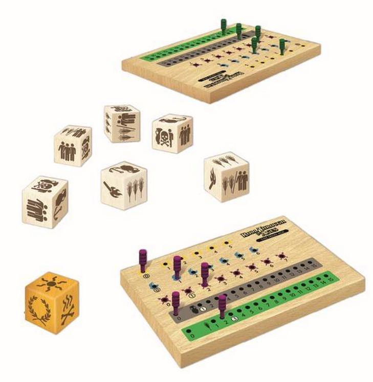 Der gelbe Schicksalswürfel ist neu im Spiel und bringt zusätzliche Spannung, aber auch Interaktion. So sorgt das Symbol „Tributforderung“ für Unmut bei den schwächeren Mitspielern, wenn deren Kampfstärke geringer ist. Gibt ein davon betroffener Spieler allerdings eine Ware ab, kann die Tributforderung verhindert werden. Mit dem „Eroberungssymbol“ kann freiwillig gekämpft werden. Dann wird die eigene Kampfstärke plus eventueller Boni mit den bereits erfolgten Eroberungen verglichen und bringt entsprechende Tribute. Nach jedem Kampf, egal ob erfolgreich oder nicht, verliert der Spieler eine Militäreinheit oder ein Schiff. Eine erfolgreiche Eroberung wird auf dem Wertungsblock markiert und macht damit die nächste Eroberung schwieriger. Am effektivsten scheinen die gekreuzten Knochen zu sein, denn dann darf ein Würfel, auch der Schicksalswürfel selbst, auf eine beliebige Seite gedreht werden. Und das kann dann auch schon mal statt einem Barbarenüberfall eine Seuche bei den Mitspielern auslösen, die dann sofort drei Punkte verlieren.