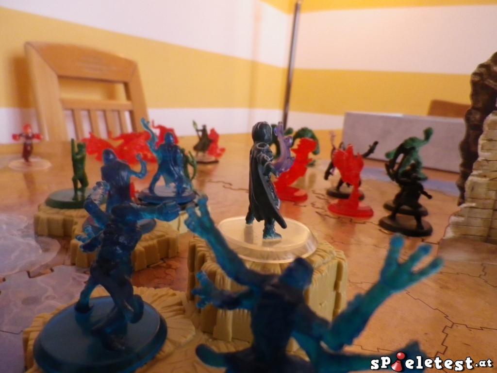 Das Spiel wird rundenweise gespielt, wobei sich jede Runde in mehrere Phasen gliedert und ein Spieler alle Phasen durchläuft, bevor der nächste an die Reihe kommt. Neben eher selbstverständlichen Aktionen wie Karten nachziehen oder untappen sind vor allem zwei Dinge interessant: Bewegung und Angriff. Egal, was das Spielziel ist (und ja, auch dieses wird vom Szenario vorgegeben), wir kommen nicht daran vorbei, uns gegenseitig die Schädel einzuschlagen.