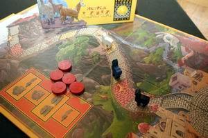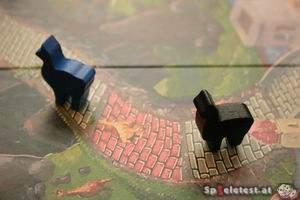 Nun greifen alle Spieler reihum in den Futterbeutel und ziehen ein bis fünf Futtersteine verdeckt heraus. Haben alle zugelangt werden die Gewinner der Wette ermittelt. Diese dürfen (sie müssen sogar) dann so viele Felder ziehen wie sie Steine in der Hand haben. Auf dem Weg zum Gipfel des Vulkans (hat ein Vulkan überhaupt einen Gipfel :o) gibt es zwei Abkürzungen. Kommt man auf ein Feld wo bereits ein Lama steht wird dieses kurzerhand um ein Feld nach hinten verdrängt. Wer über das Ziel hinausschießt muss wieder von vorne Beginnen.