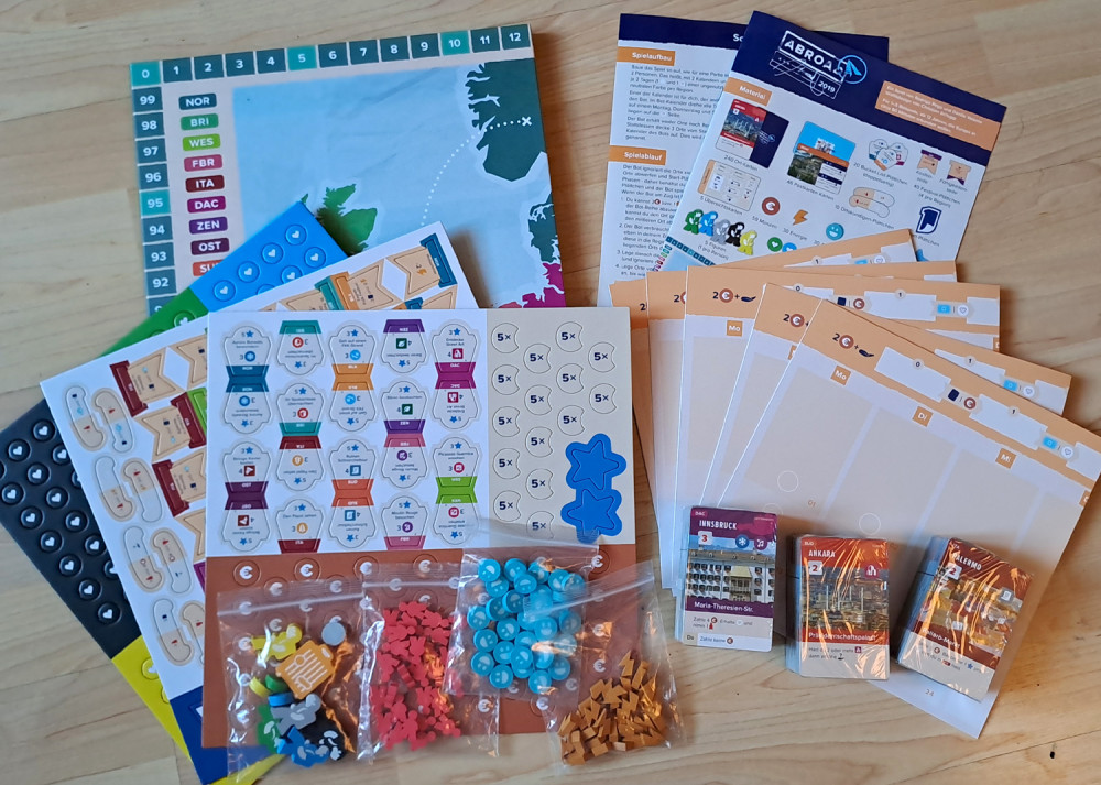 Abroad wird über vier Runden gespielt, wobei jede Runde sieben Phasen hat. Die zweite Phase ist die Hauptphase, in welcher die Spieler reihum ihre Aktionen ausführen. Die anderen, deutlich kürzeren Phasen dienen vor allem dazu, das Material anzupassen oder Wertungen auszuführen. In der eigenen Aktionsphase können die Spieler mit ihrer Figur mit dem Zug über Regionsgrenzen fahren oder mit dem Flugzeug eine beliebige Region ansteuern. Das kostet aber Energie oder Geld. Aufregung und Ortskundige sind weitere Ressourcen im Spiel. Nach der Bewegung führen die Spieler in der aktuellen Region eine von vier möglichen Aktivitäten durch. Die am meisten genutzte ist es, eine Ortskarte aus der Hand auszuspielen und die auf der Karte verzeichnete Anzahl an Tagesmarkern vom Kalender in die Region zu legen. Die Ortskarte kommt anschließend auf den eigenen Kalender. Ausgespielte Karten gewähren Effekte, die jedoch teilweise an bestimmte Voraussetzungen geknüpft sind. Zusätzlich ist auf manchen Ortskarten ein Wochentagsbonus verzeichnet, den man erhält, wenn die Aktivität an diesem Tag endet. Um hier ein wenig flexibler zu bleiben, kann durch die Ressource Aufregung die Anzahl der benötigten Tage der Ortskarte reduziert werden.