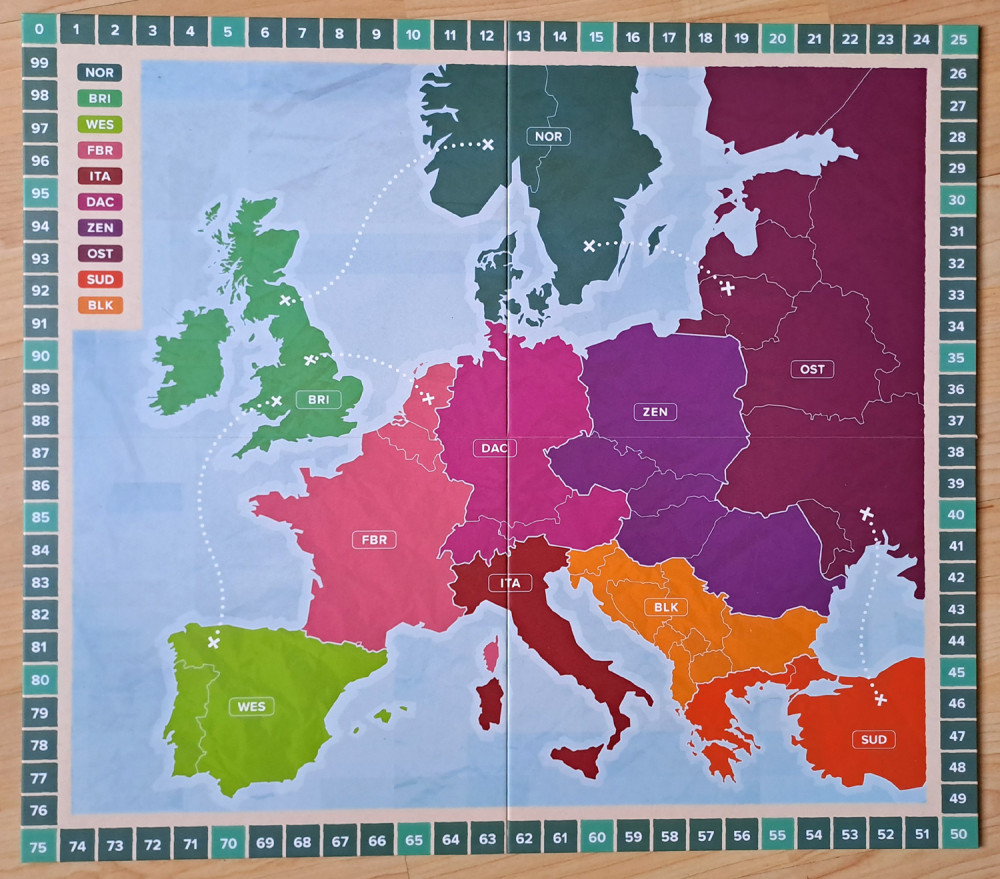 Auf dem Spielplan sind die Länder Europas zwar nicht näher bezeichnet, jedoch in insgesamt 10 Regionen zusammengefasst. Die Staatsgrenzen sind mit ein bisschen gutem Willen und etwas geografischem Verständnis zu erkennen. Vor einer Partie werden jeder Region zwei zugehörige Bucket-List-Plättchen und ein Ortskundigen-Plättchen zugeordnet. Jeder der Spieler startet mit sieben zufälligen Ortskarten und einer zufälligen Postkarte und beginnt seinen Europa-Trip aufgrund dieser Kartenkonstellation in einer Region seiner Wahl. Die 28 Tage des eigenen Kalenders werden vorher noch mit Tagesmarkern belegt.