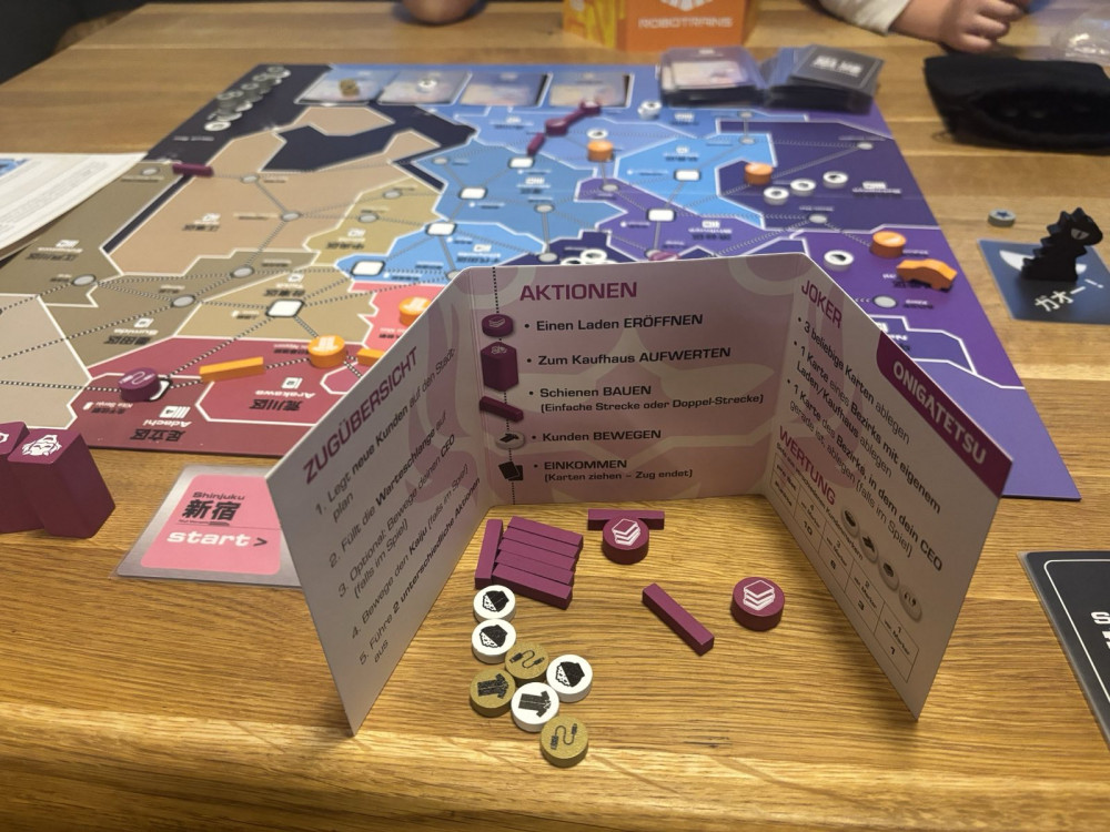 Die 72 Bezirkkarten sind gemischt, die ersten vier Karten sind aufgedeckt, die ersten Kundenmarker kommen aus den Beutel auf den Spielplan und jeder hat das Spielmaterial seiner Fraktion inklusive Sichtschirm. Meine Lieblingsfraktion ist Onigatestsu und ich sage liebend gerne dieses Wort mehrmals im Spiel damit ich ein bisschen japanisch klinge. Die Sichtschirme beinhalten auch den Spielablauf in zusammengefassten Schritten aber diese werden nach ein zwei Partien überflüssig, weil es doch recht einfach zu verstehen ist. Die ersten Schienen werden gelegt und die ersten Geschäfte gebaut. Shinjuku nimmt im wahrsten Sinne des Worte Fahrt auf.