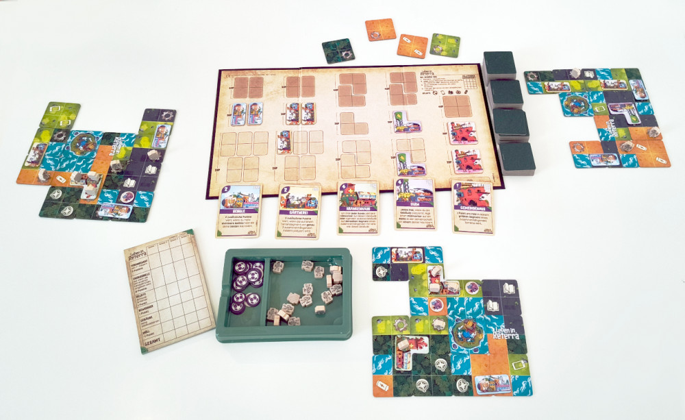 Wir legen den Spielplan in die Tischmitte, der eigentlich nur ein Nachschubcontainer ist. Leben in Reterra kennt drei vorgefertigte Sets, die aus Gebäudekarten und -plättchen bestehen. Da die Gebäudekarten doppelseitig sind, haben wir sogar sechs vorgefertigte Sets. Es steht uns aber frei (die Einhaltung gewisser Regeln vorausgesetzt), Karten aus diversen Sets zu einem neuen Set zu kombinieren.