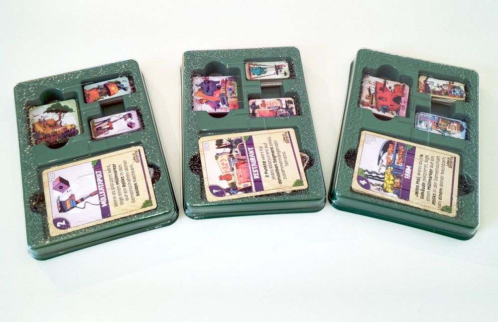 Nun bekommt jeder Spieler ein Startplättchen sowie drei geheime Plättchen aus dem Vorrat. Vom restlichen Vorrat werden ein paar Plättchen offen ausgelegt. Sind die Bewohnerfiguren und Müll-/Reliktmarker bereitgelegt, kann es auch schon losgehen.