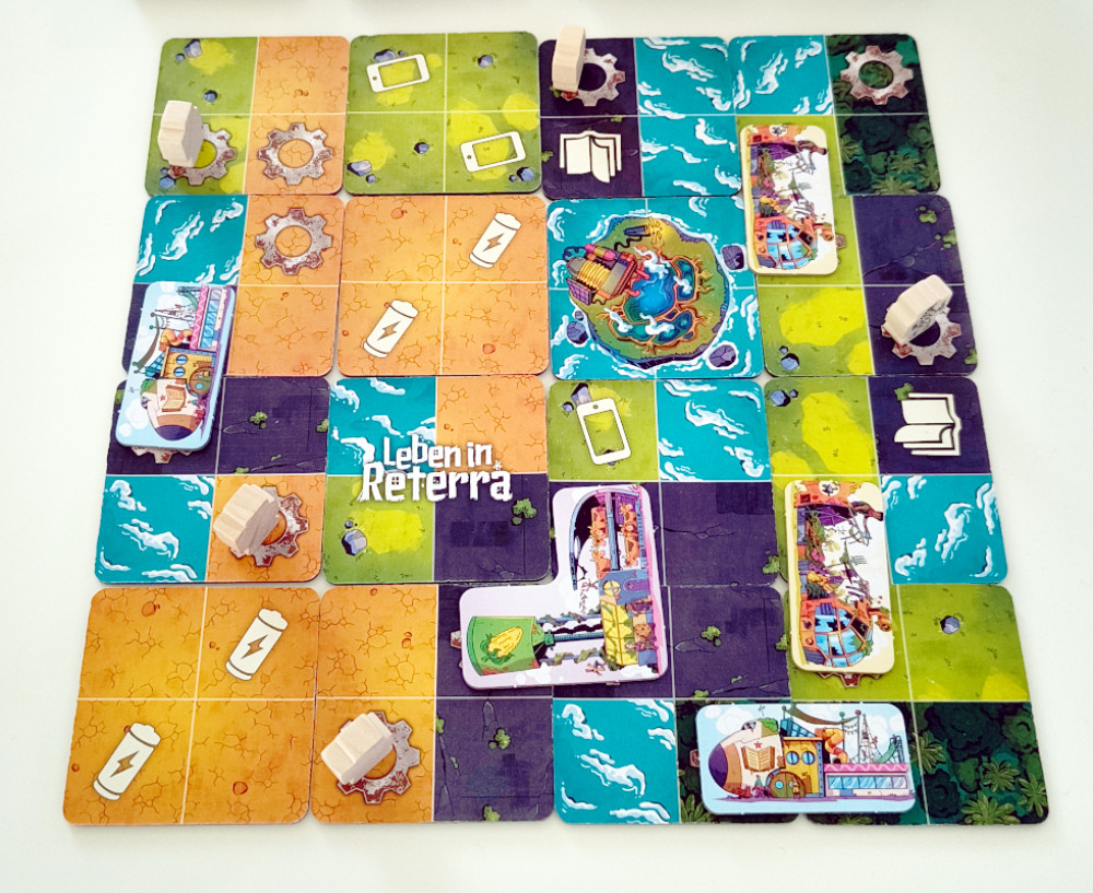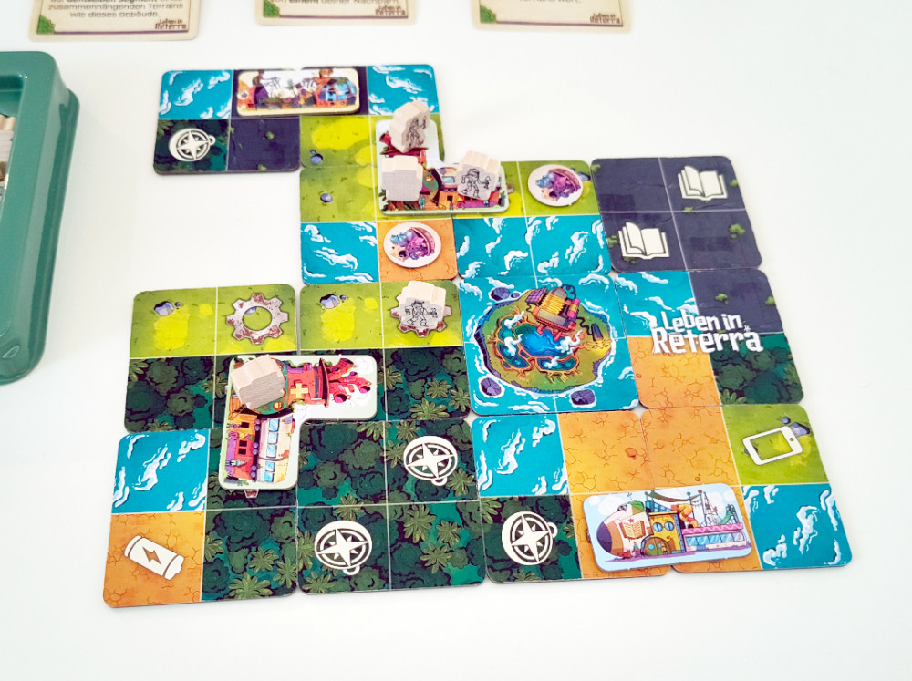 Jedes Plättchen zeigt vier Felder, jedem ist einer von fünf Landschaftstypen zugeordnet. Das ist später wichtig, weil größere Gebiete gleicher Felder Punkte bringen. Ich darf aber aneinanderbauen, was ich will. Fast wichtiger sind nämlich: Symbole! Oft gibt es Zahnräder, auf diesen kann man Bewohner oder Gebäude bauen; für Letztere sind Zahnradgruppen in der Form des Gebäudes notwendig, die komplett auf einer Art von Terrain liegen müssen (also doch wieder gleiche Landschaften aneinander legen...). Eine andere Form von Symbolen sind die Relikte: Mobiltelefon, Fußball, Batterie etc. Sie sind potentiell jeweils einen Siegpunkt wert.
