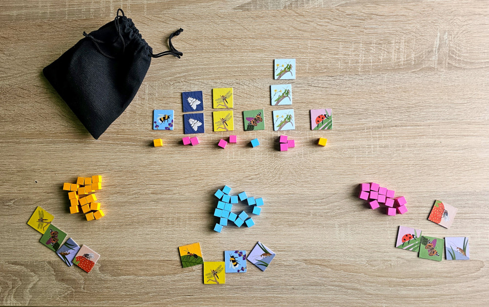 Bugs Buddy ist ein wirklich kurzes und einfaches Spiel, das wohl eher an die kleineren Zocker gerichtet ist. Grundsätzlich ist euer Ziel spielerzahlabhängig viele Holzwürfelchen loszukriegen, was sich durch das Auslegen diverser Insektenplättchen machen lässt. Jedes der neun unterschiedlichen Krabbeltiere gibt es dabei exakt achtmal, jedoch sind die Plättchen auch zusätzlich doppelseitig bedruckt, was das „Mitzählen“ der einzelnen Fraktionen deutlich erschwert.