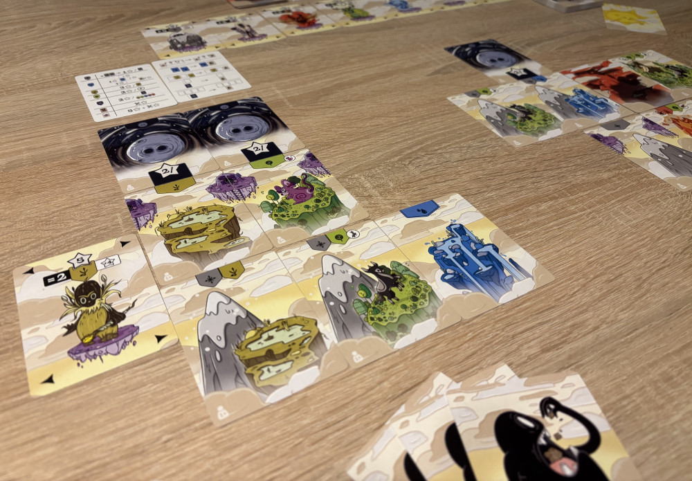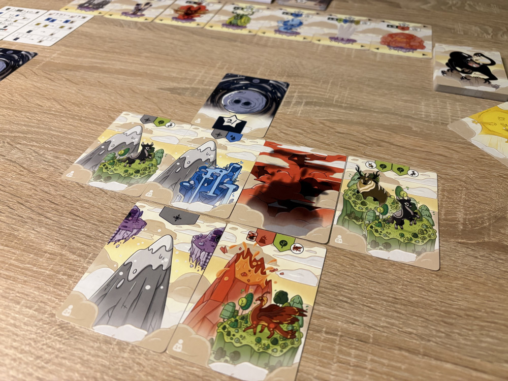 Zu Beginn erhält jede Person eine Startkarte und zieht anschließend drei neue Landschaftskarten. Zwei davon werden weitergegeben und in weiterer Folge das ganze nochmal mit einer einzelnen Karte wiederholt. Danach legt man die Karten an die eigene Auslage an, immer angrenzend an bereits liegende Karten. Jede Landschaftsart hat dabei ihre eigenen Platzierungsregeln, um das Maximum an Punkten zu generieren. Aber Vorsicht: wird eine Karte unpassend platziert, erscheint ein sogenannter Weltenfresser, der den betroffenen Platz dauerhaft belegt.
