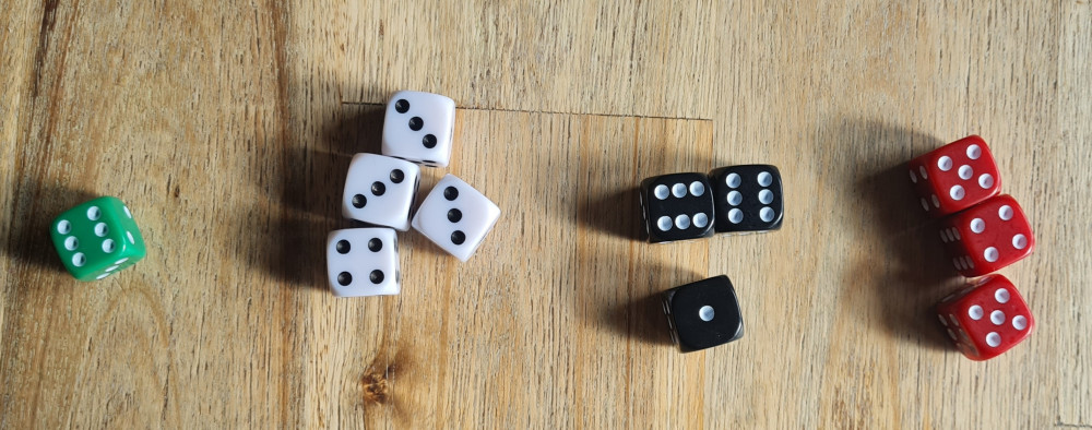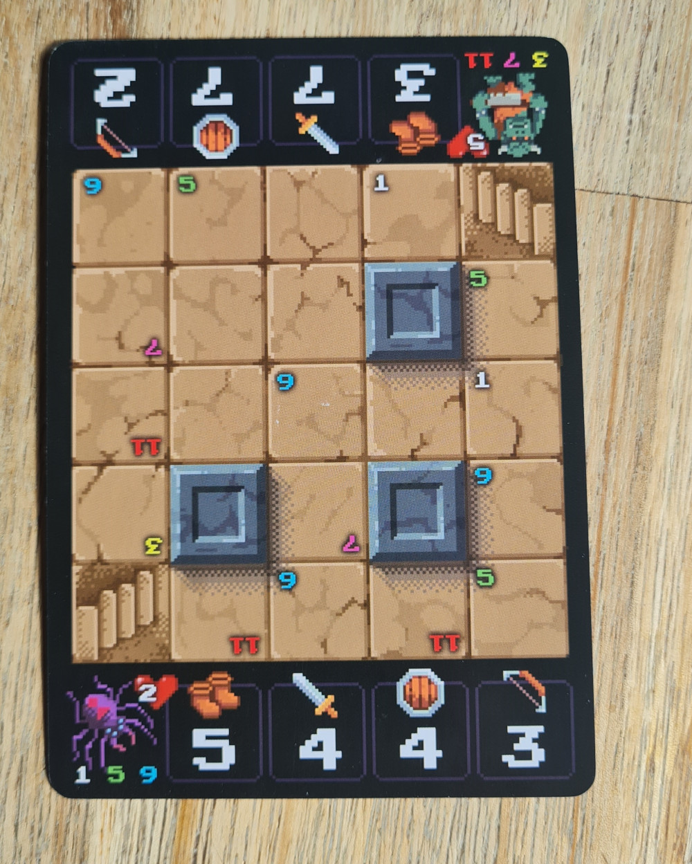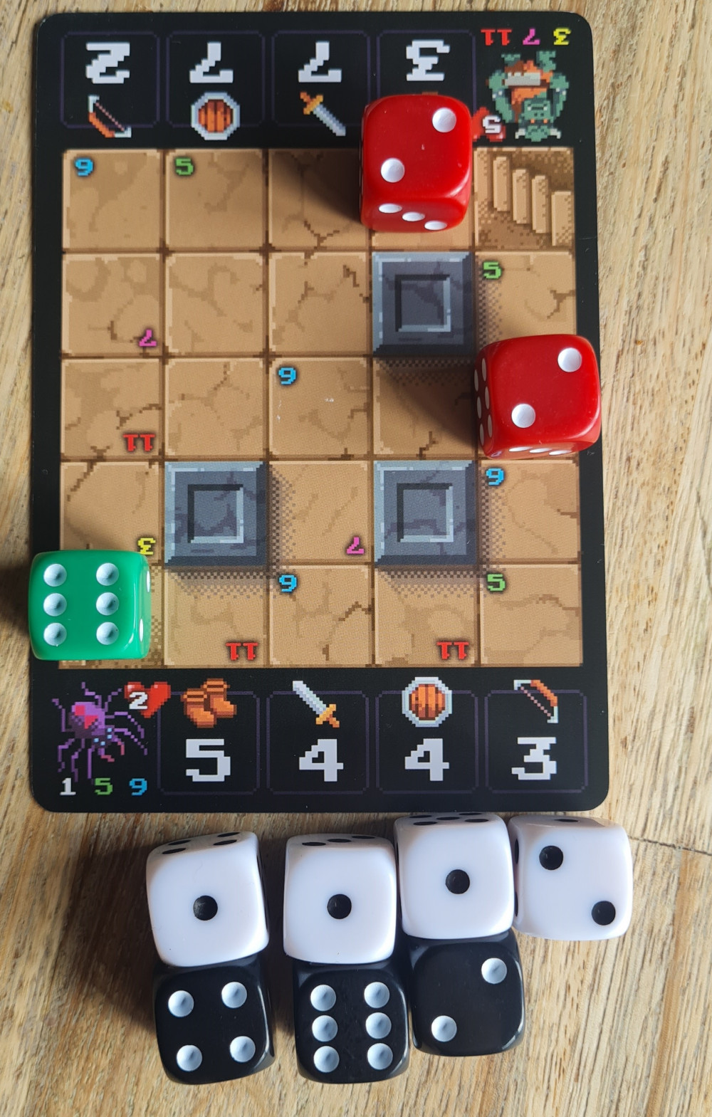 Der Spielfluss ist klar strukturiert: planen, drei Würfel setzen, Zug abwickeln. Weil Angriff, Bewegung und Verteidigung miteinander konkurrieren, wirst du gezwungen, klare Entscheidungen für deine Würfel zu treffen. Verteidigung erhöhen, um keinen Schaden zu erhalten oder Bewegung pushen, um erst gar nicht in Schlagweite zu geraten? Die Varianz entsteht über zwölf unterschiedlich dichte Layouts, steigende Gegnerzahlen und das schrittweise Aufrüsten deines Helden – eine einfache Progression, die dennoch merkliche Spielstile erlaubt: Willst du dich defensiv einigeln, aggressive Nahkampf-Sprints oder kontrollierte Fernkampfrunden forcieren? Alles möglich! Der Material-Aufwand bleibt minimal, die Partien bleiben dadurch flott auf- und abgebaut.