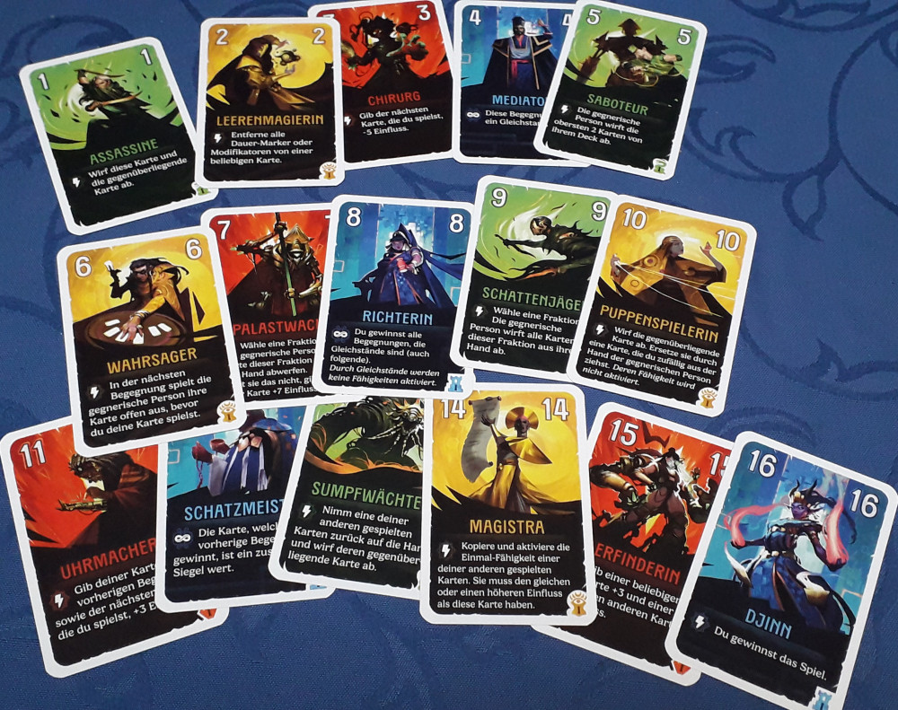 Es bietet viele Möglichkeiten, die situationsbedingt clever gewählt werden sollten. Die Karten sind verständlich beschrieben, die Stärke korreliert gut mit der Fähigkeit des Charakters.