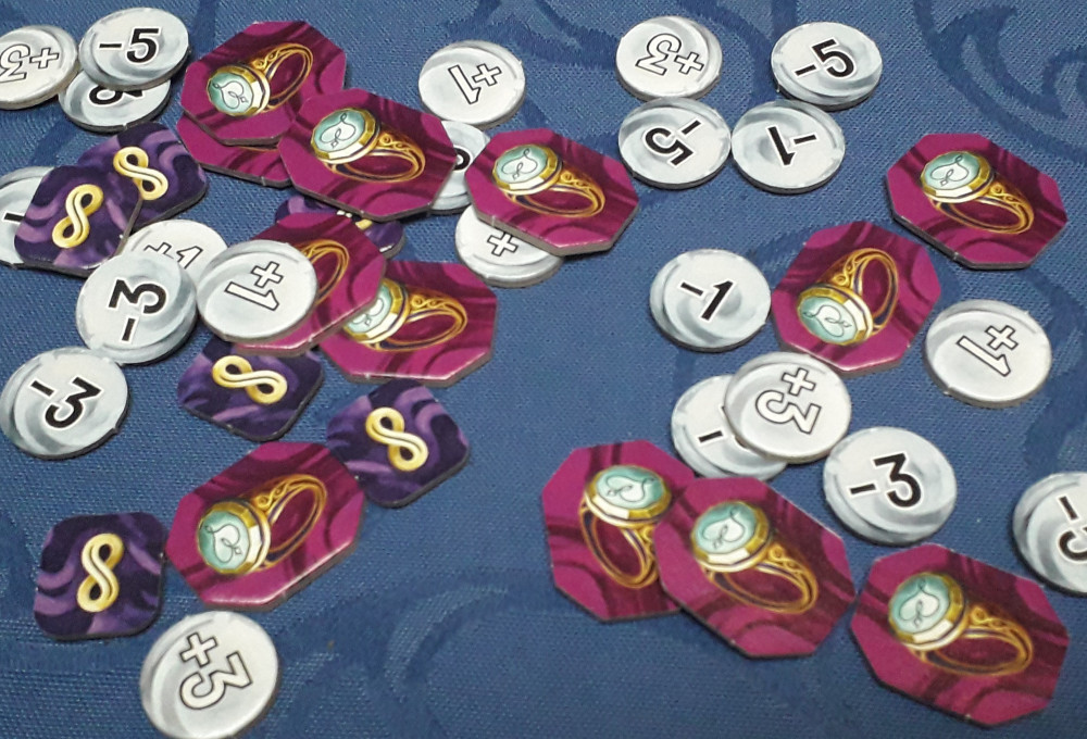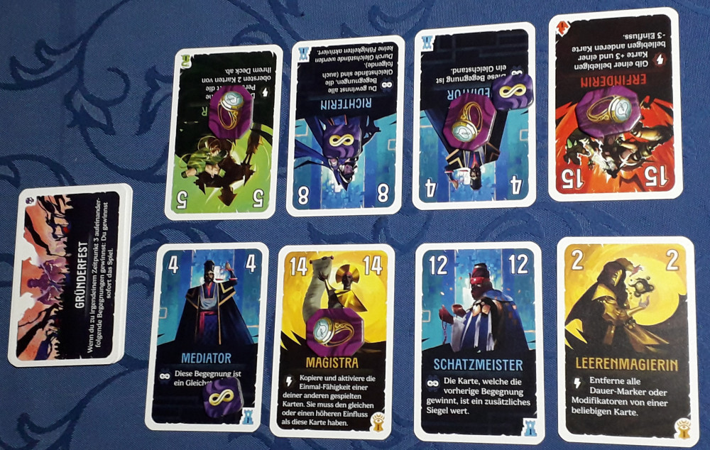 Ein weiteres Grundprinzip in Cardia lautet: Die Vergangenheit kann ebenso beeinflusst werden wie die Zukunft. Bereits abgewickelte Duelle bleiben in der Arena liegen und zeigen den Zeitstrahl. Verliere ich ein Duell mit meiner Uhrmacherin (Stärke 11), dann darf ich die Stärke meiner in der vorigen Begegnung gespielten Karte mit einem +3 Marker pimpen, ebenso die im nächsten Duell gewählte.