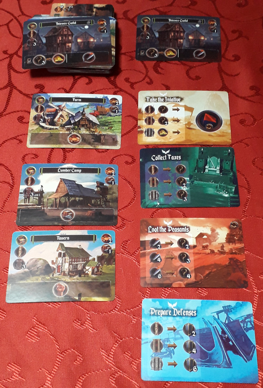 Jeder Spieler startet mit einem Schloss. Aktiviert man es, so wie auch andere Karten, kommt man in den Genuss der Fähigkeit des Gebäudes. Im Fall des Standardschlosses bekommt man je einen Nahrungsmarker, Stärkemarker und Gegenstandsmarker ODER man sucht sich zwei aus den drei Markern aus ODER man aktiviert die Kaufaktion und erwirbt eine Gebäudekarte oder eine Aktionskarte. Weil man sowieso in jedem Spielzug eine Kaufaktion und eine Angriffsaktion gratis mit dabei hat, wird man speziell zu Beginn eher Ressourcen nehmen.