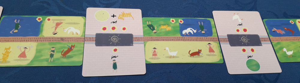 Die zu wertenden Paare, das geht aus der Anleitung nicht ganz klar hervor und wurde beim Autor nachgefragt, müssen dabei nicht auf einer Karte vorkommen, es zählt jedes Paar Ente und Katze entlang der Strecke auf der eigenen Seite der Gleise.