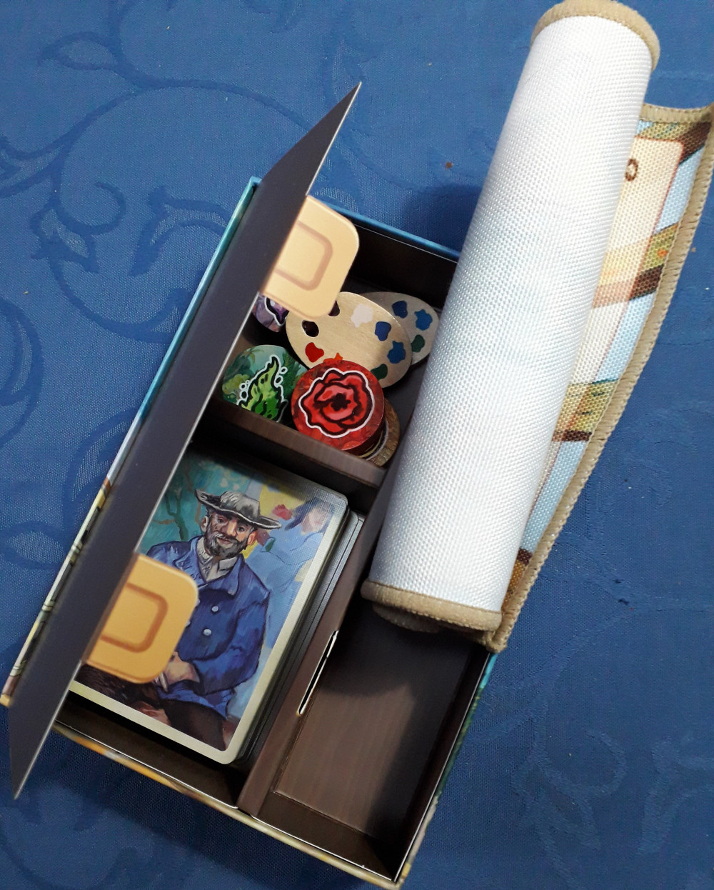 Die Leinwand, eigentlich eine Treppe zur Anzeige der Wertigkeit der vier Farben, liegt aus und beide Spieler bekommen 12 Handkarten ausgeteilt. Vier der Themenkarten kommen verdeckt zur Seite. Sonst könnte man ja genau wissen, welche Karten der Gegenspieler besitzt und wer will das schon?
