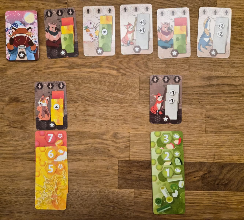 Um nicht kulinarisch auszuarten (schließlich ist das hier kein Foodblog), dreht sich nun alles um das Spiel Umami. Mit Zutatenkarten aus drei Kategorien – herzhaft, sättigend und frisch – müssen die Spieler in ihrer Auslage aus jeweils drei Zutaten ein Gericht nach den Wünschen der Gäste zubereiten. Kann man den Wunsch eines Gasts erfüllen, nimmt man ihn zu sich und erhält dafür potenziell Punkte am Spielende.