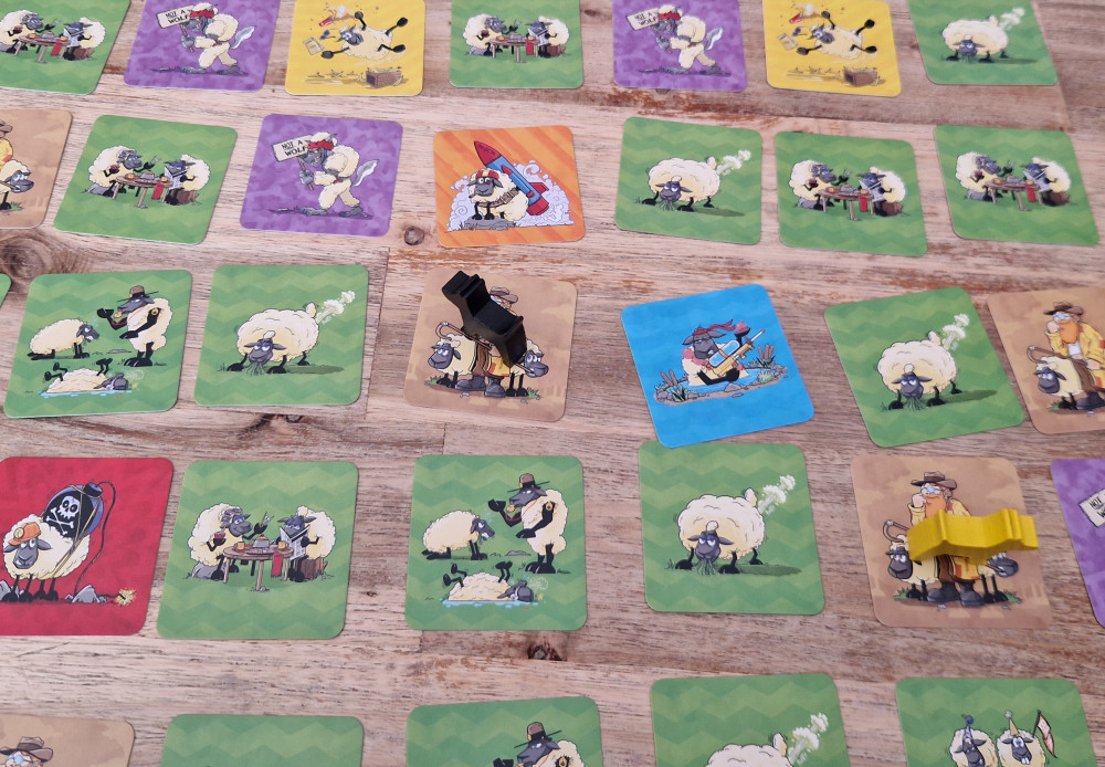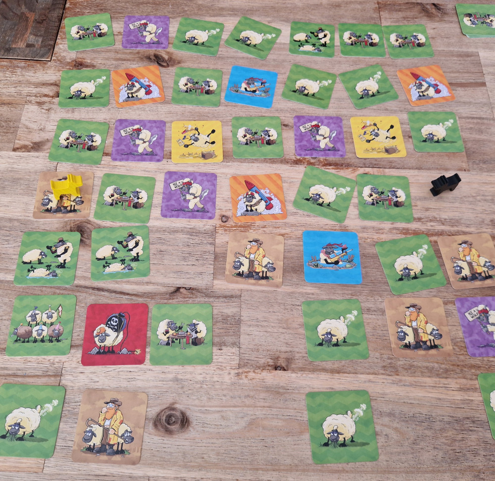 Wir legen zu Beginn eine Weide als Raster aus Karten aus. Mit zwei bis vier Spielern entsteht ein sieben-mal-sieben großes Feld, zu fünft oder sechst ein neun-mal-neun großes Feld. Reihum ziehen wir unseren Hund orthogonal auf eine angrenzende Karte und führen deren Effekt aus: Grüne Schafskarten wandern verdeckt in unsere Herde und zählen am Rundenende Punkte. Aktionskarten verändern das Feld oder unsere Position. Mit dem Raketenschaf springen wir zum Beispiel zwei Felder weit, das Rutschschaf zwingt uns zum Weiterrutschen, das Blockierschaf sperrt eine grüne Karte, der Wolf versetzt einen gegnerischen Hund um ein Feld, und das Bombenschaf sprengt alle benachbarten Karten und kann so ganze Bereiche aus dem Spiel reißen. Wichtig: nicht in eine Sackgasse laufen.