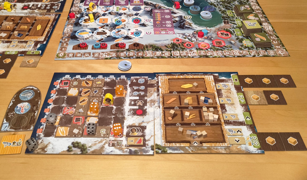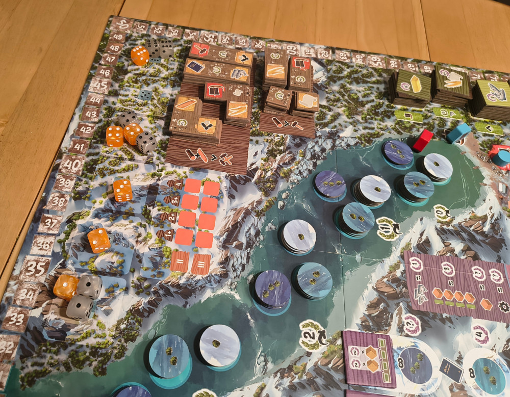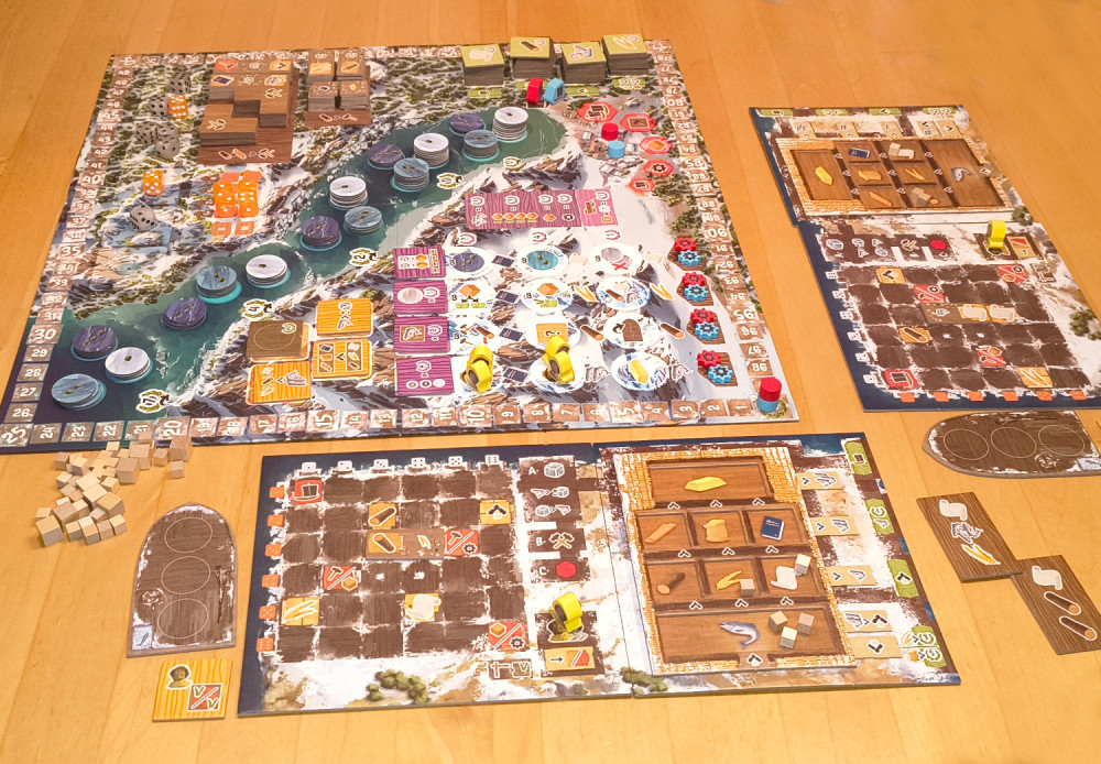 Wenig verwunderlich, zeigt der Spielplan den Fjord, mit einigen Stellen für den Fischfang. Am Ende des Fjords liegt der Hafen, in dem die Fischerboote ihre Homebase haben. Gleich daneben warten Tavernen, sowie ein Auftragsmarkt. Den restlichen Platz nehmen Fortschrittsleisten und Vorratsstapel ein, außerdem eine Leiste für Würfel.
