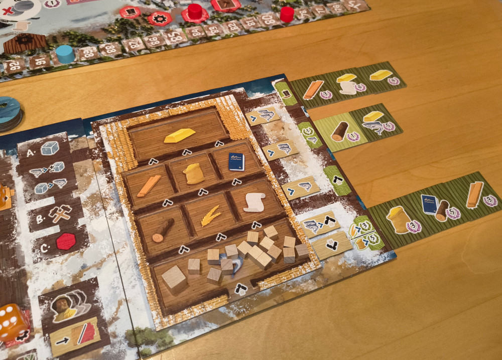 Da Saltfjord nur dort Interaktion hat, wo es darum geht, etwas zu nehmen, bevor es jemand anderer nimmt, ist man auf weiten Strecken frei in seinem Spieltempo. Ich kann etwa früh ins Engine investieren, wodurch andere Dinge auf der Strecke bleiben. Mit der Folge, dass ich anfangs langsam vorankomme, dafür aber am Ende auf der Überholspur bin. Oder ich stürze mich auf das Erfüllen von Aufträgen, um über die Bonusaktionen am Rundenende Meter zu machen. Sich rasch Arbeiter zu sichern, ist auch eine gute Strategie. Welchen Weg man einschlägt, hängt unter anderem von der Spezialfähigkeit ab, die mir am Beginn zugelost wurde. Neben der Spezialfähigkeit gibt es noch weitere Dinge, wie Startressourcen oder Wertungsplättchen auf den Entwicklungsleisten, und natürlich die Würfelergebnisse, die eine kleine Abwechslung von einer Partie zur nächsten versprechen.