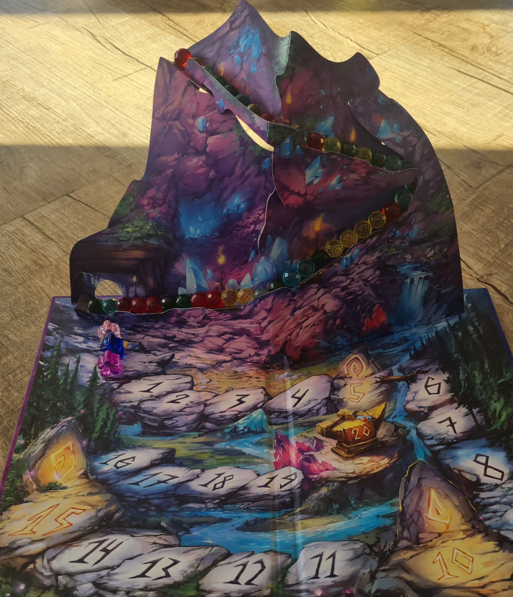 Die eigentliche Innovation ist der 3D-Berg als Kristallquelle. Jedes Mal, wenn wir unten eine Murmel ziehen, rollen die übrigen nach. Das sieht stark aus und ergibt mechanisch Sinn, weil wir vorausahnen, was als Nächstes kommt. In unserer Ausgabe hakt der Berg allerdings: Oben ist es etwas eng, Murmeln bleiben hängen und müssen angestupst werden. Unten fängt der Knick ebenfalls gelegentlich Kugeln. Laut Anleitung soll das Spielbrett zunächst "überdehnt" werden. Das hatten wir gemacht, aber die Probleme bestanden dennoch.