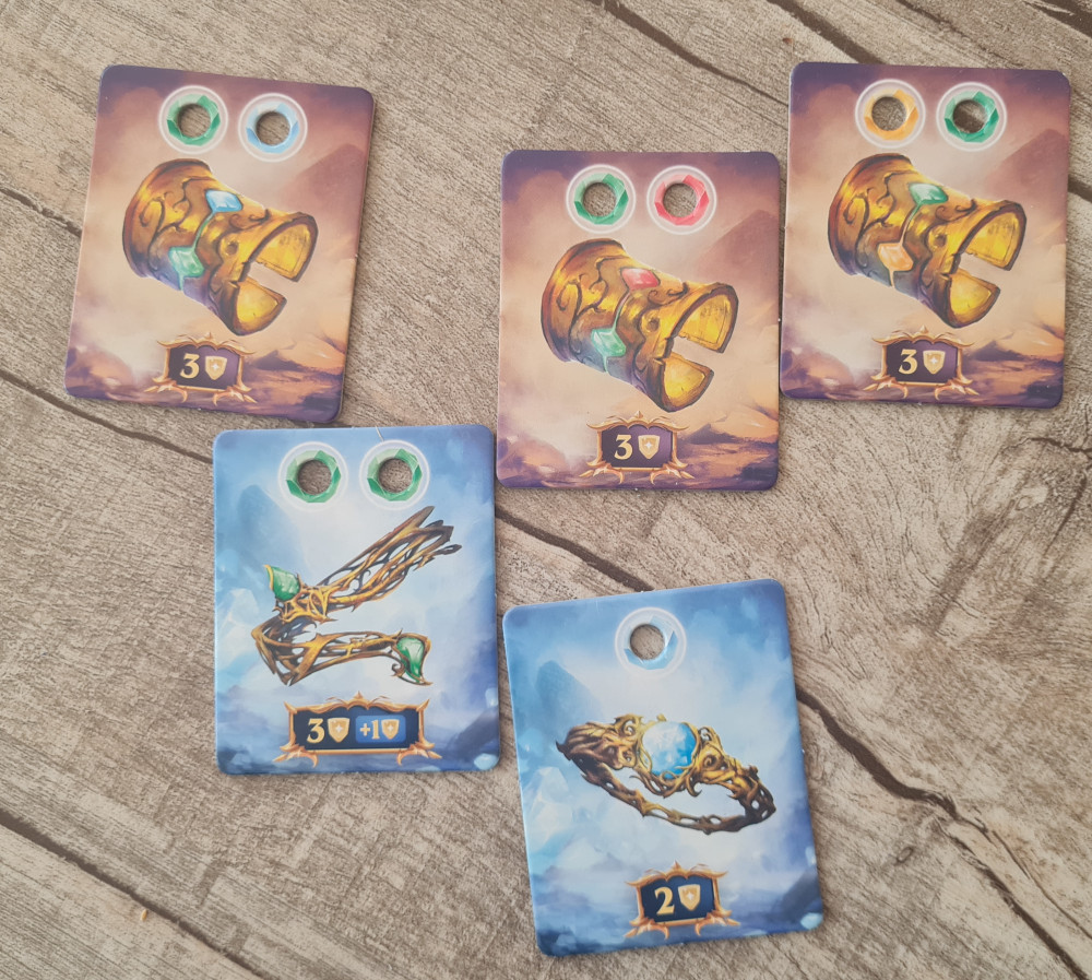 Alternativ (und meist sinnvoller) platzieren wir die Edelsteine passend auf die Aussparungen unserer Schmuckplättchen. Vollendete Plättchen bringen Punkte, blaue Set-Karten geben zusätzliche Boni.