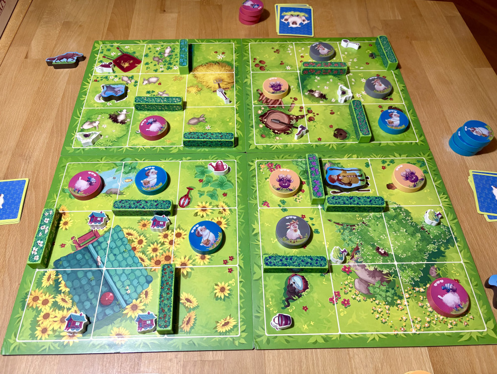 Wer sich beim Anheben der fast drei Kilogramm schweren Spieleschachtel keine Bruch gehoben hat, der wird beim Öffnen das eine oder andere Ahh und Ohh von sich geben. Sauber aufgeteilte kleine Abteile mit extra Deckel, magnetisches Spielmaterial und vier echt schwere Spielplanteile, die ebenfalls einen magnetischen Kern haben, sind schon sehr außergewöhnlich für ein kindlich angehauchtes Schafe-Versteckspiel, das es in sich hat. Und im Kern ist es gar nicht so kindlich-verspielt, denn wir haben es hier mit einem taktisch anspruchsvollen Familienspiel zu tun.