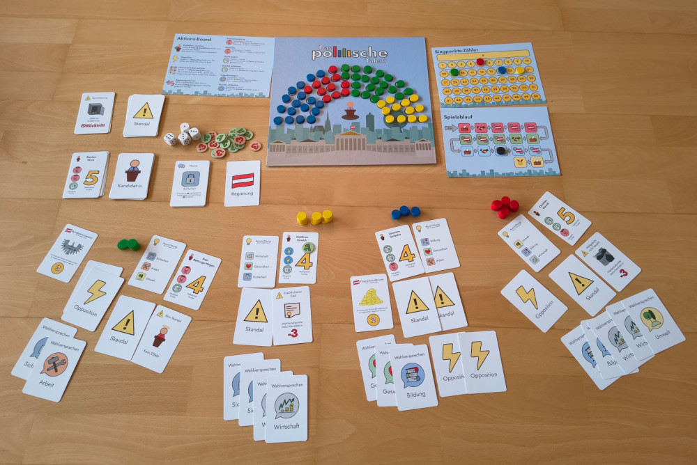 Warum bekommt man am Ende jeder Runde Punkte, und nicht einmalig nach geglückter Wahl? Die Politiker kleben mehr oder weniger an ihren Sesseln und können drei Jahr (Runden) lang Aktionen durchführen. Wir sind aber nicht davor gefeit, dass einzelne Abgeordnete das Lager wechseln, Skandale meinem Spitzenkandidaten schaden, die Opposition überraschende Aktionen setzt... Manche dieser Aktionen kann ich immer durchführen, einige kann ich nur mit der Zustimmung einer Parlamentsmehrheit erreichen, und andere benötigen einen gelungenen Würfelwurf, welcher von den Stärken meines Spitzenkandidaten beeinflusst ist.