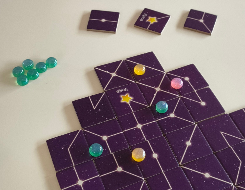 Die Qualität des Spielmaterials ist großartig: Die Plättchen sind extrem dick und die Spielsteine sind aus Glas, leicht eingefärbt und funkelnd. Und das allerbeste: Die Sterne und Linien leuchten! Sie werden durch Licht aufgeladen und geben es im Dunkeln wieder ab.