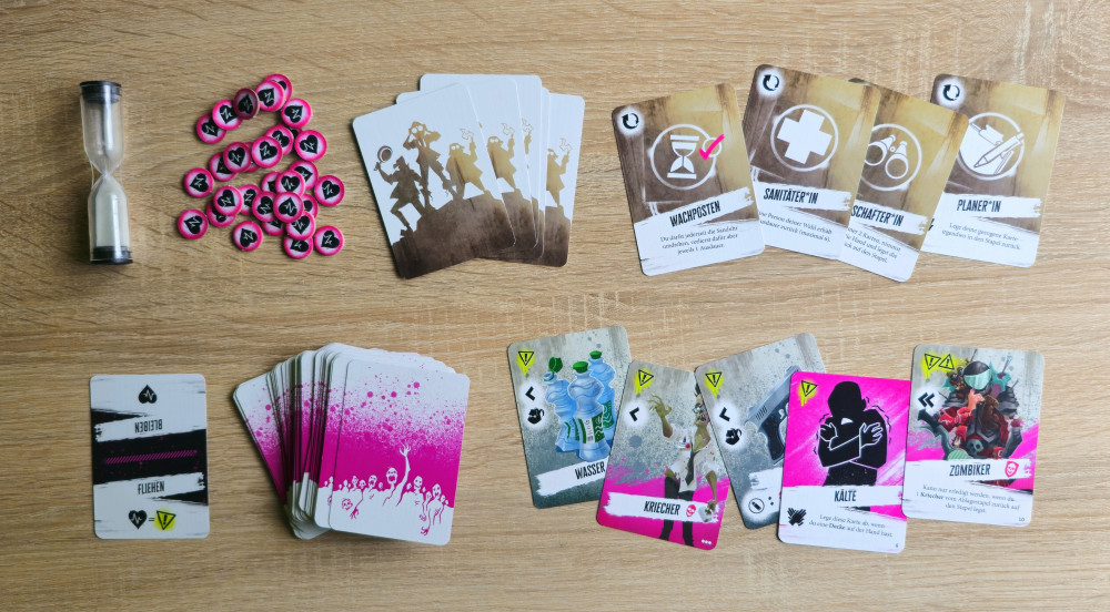 Elemente die erschwerend hinzukommen sind einerseits eine eingeschränkte Kommunikation, da nur derjenige sprechen darf der aktuell am Zug ist und ein deutlicher Zeitdruck! Letzterer wird durch eine Sanduhr verursacht die somit Spielzüge in real-time forciert, ein Ablaufen gilt dabei automatisch als Niederlage, wobei ein erneutes Umdrehen Ausdauer kostet. Etwas mehr Taktik und Abwechslung wird auch durch diverse Rollenkarten miteingebracht, sowie den Funktionsweisen mancher Karten, die man erst im Verlauf des Spiels kennenlernt.