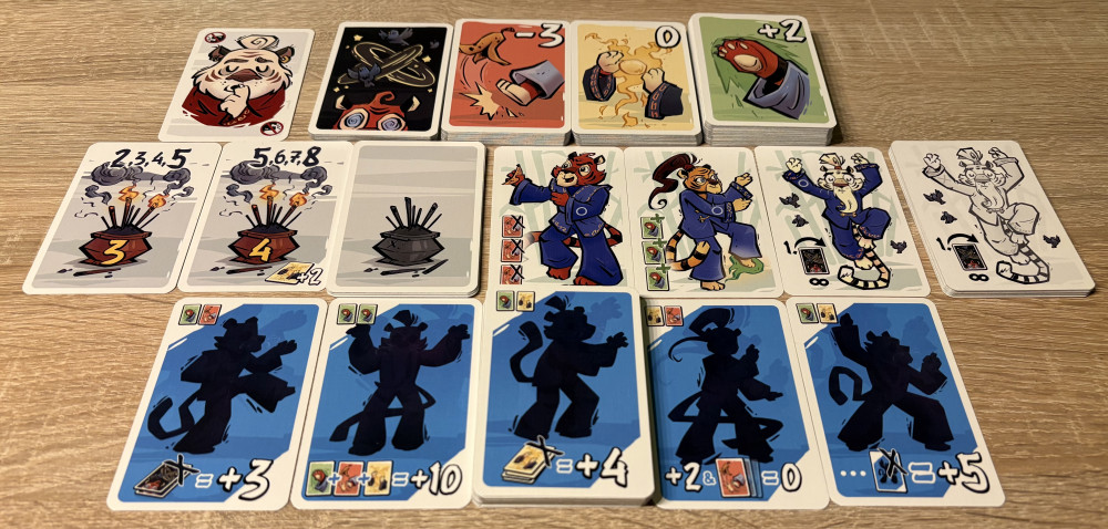 Neben einer anfangs identen Starthand wählen die Spieler vier Kombokarten aus, die sie ihrem Deck hinzufügen. Diese wiederrum fügen weitere Grundkarten hinzu. Dieses gesamte Kartenset wird nun gut gemischt, zehn werden verdeckt gezogen und schon kann es losgehen! Jede Runde wird eine Räucherstäbchen-Karte gezogen, welche angibt wie viele Karten diese Runde insgesamt gespielt werden müssen und wie viele die Spielenden in ihrer Hand ansehen dürfen. Beim Spicken auf die Vorderseiten ist aber Eile geboten, denn wer am schnellsten dabei ist und „Stopp“ ruft, der beendet damit diese Phase für alle. Die Angesehenen werden der Reihe nach unter die anderen Karten gelegt und sich ihre Reihenfolge hoffentlich gut eingeprägt.
