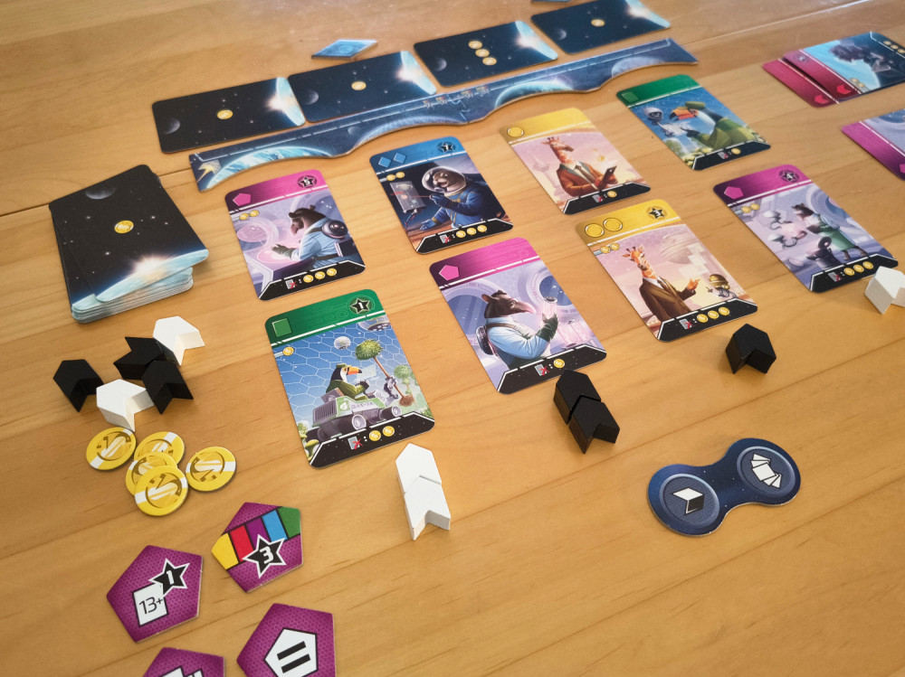 Zwischen den Spielern liegt die Ablageleiste mit vier Planeten. An jedem liegen eine verdeckte und zwei offene Karten. Daneben liegen die Vorräte für Münzen und noch nicht verteilte Raumschiffteile, sowie ein paar Bonusplättchen. Schnell noch das Startplättchen zwischen die Spieler gelegt, schon kann es losgehen.