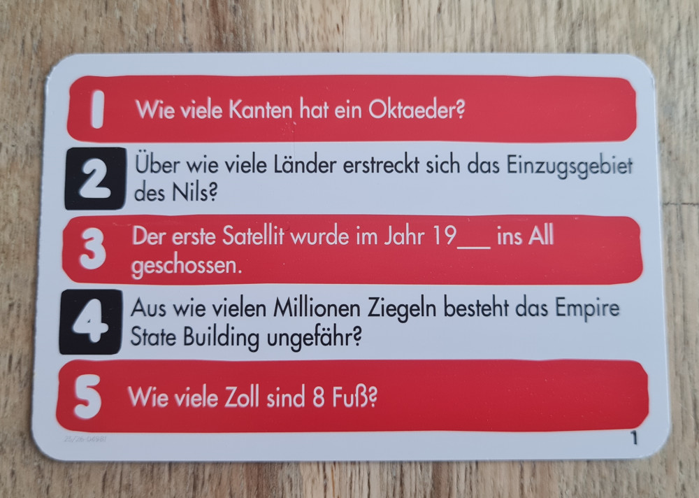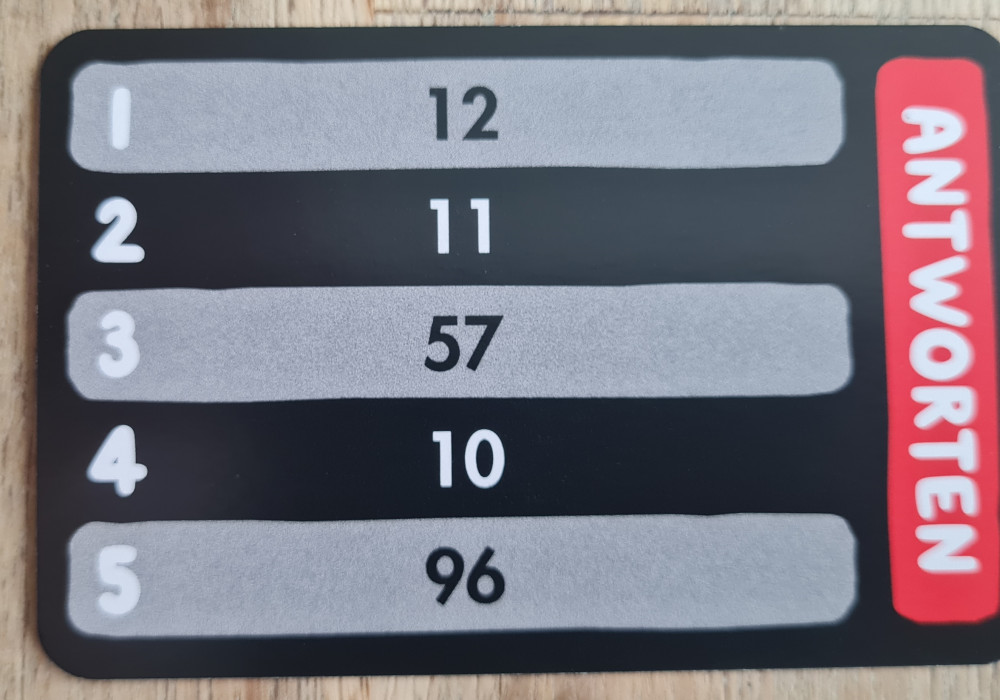 Wer am Ende noch einen klaren Champion küren möchte, nutzt die zusätzlichen Championkarten. Hier sind die Antworten frei formulierbar und nicht mehr auf Zahlen zwischen 1 und 99 begrenzt. Die Gruppe entscheidet dann, welche Antwort überzeugt.