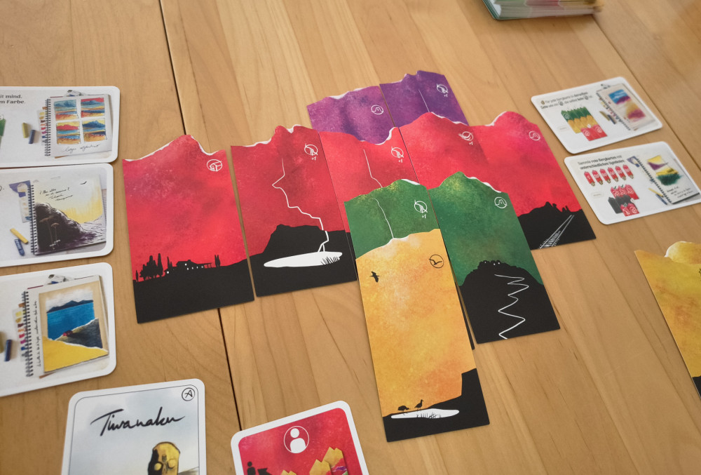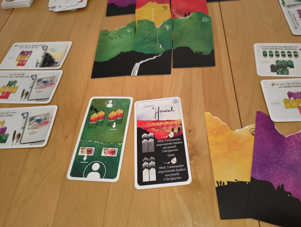 Jede Gruppe sammelt pro Runde zwei Bergkarten, die vor ihr ausgelegt werden. Bergkarten gibt es in vier Farben und sind an ihrer Oberfläche unregelmäßig geschnitten, sodass sich das Relief von Bergen ergibt. Wichtig ist aber nur die Farbe, denn gleichfarbige Karten werden in gleiche Reihen gelegt (es kann aber mehrere Reihen gleicher Farbe geben). Wichtig sind aber auch die darauf befindlichen Symbole.