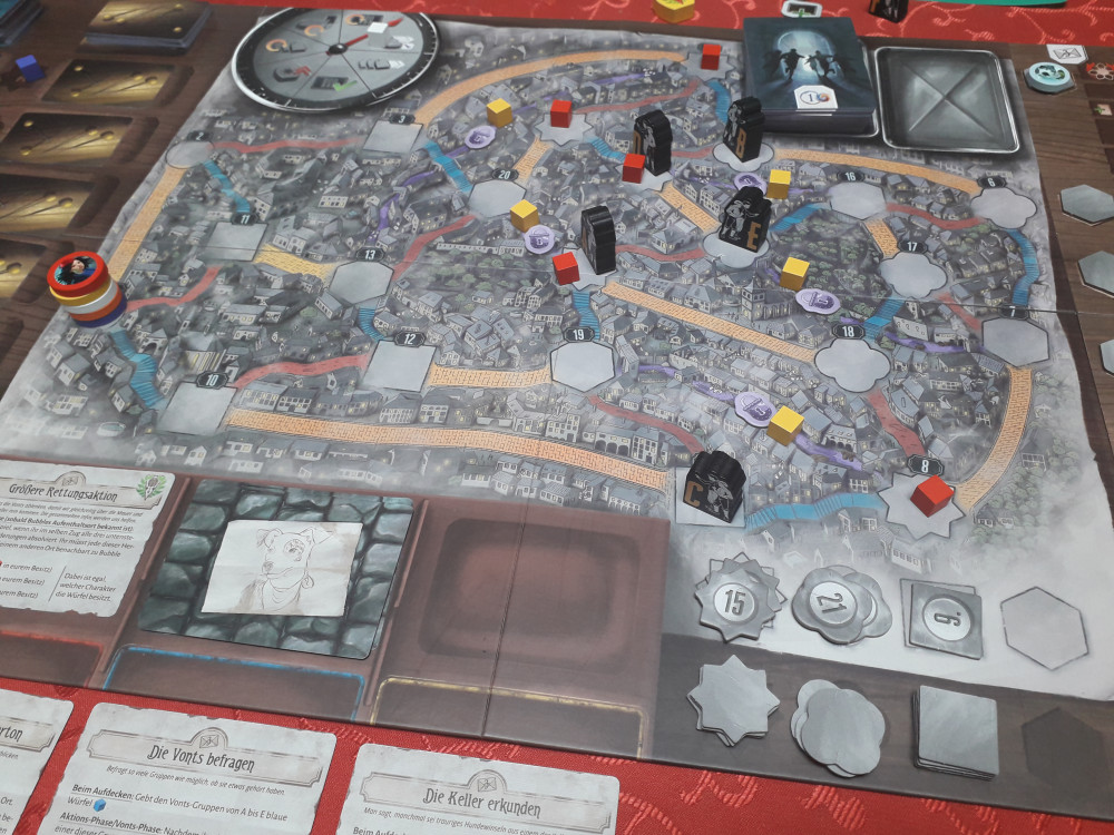 Mittlerweile weiß ich dass viele Aufgaben zu erledigen sind. Manche sind wirklich schwierig, manche - immer auch abhängig davon wo wir und wo die Vonts eben stehen - sind leichter zu absolvieren. Erledigte Aufgaben bringen Bewegungspunkte für unseren Marker auf der Fortschrittsleiste. Wir liefern uns quasi ein Parallelrennen mit dem Unruhemarker. Beide Laufstrecken haben ein paar Sonderfelder. So tauchen beispielsweise weitere Vont-Gruppen in Severton auf. Das ist echt ärgerlich...