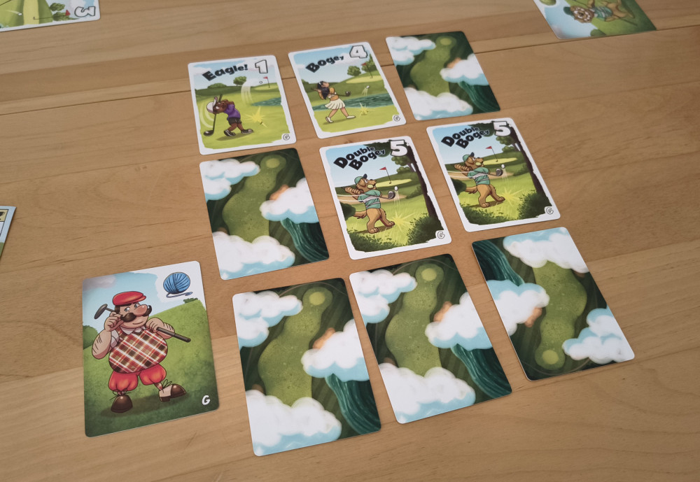 Das Spiel besteht komplett aus Karten: Da sind mal die Spielerkarten. Wählt euch einen Charakter, wodurch euch gleichzeitig eines der vier Symbole zugeordnet wird. Weiters haben wir Schlagkarten, die mit Zahlen von 1-6 sowie "+1" versehen sind. Von denen nehmt ihr euch neun Stück, legt sie in einer 3x3-Anordnung verdeckt vor euch und deckt eine in der obersten Reihe auf. Und dann sind da noch die Aktionskarten. Ganz unten liegt eine "einlochen"-Karte, darüber eine Mischung von verdeckten einlochen- und aufdecken/verschieben-Karten.