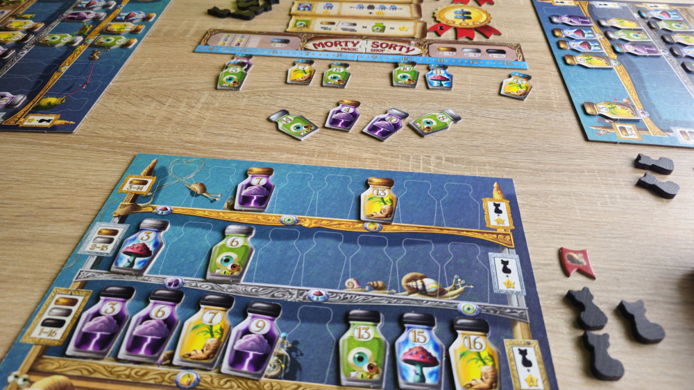 Ja auch die größten Magier würden wohl ohne Ordnung den Überblick verlieren, kein Wunder, dass dieser Zauberladen da einen ganz besonderen Wert drauflegt. Das Spielprinzip ist simpel: Zutaten-Gläser mit unterschiedlichem Inhalt, Deckel und Zahlen verschwinden erstmals im beiliegenden Beutel, um schließlich jede Runde zufällig aus diesem gezogen zu werden. Dabei wählen die Spieler reihum je eines aus (oder passen) und platzieren das Plättchen dann auf einem der eigenen drei Regalreihen des Tableaus. Wichtig dabei, die Zahlen müssen stets in aufsteigender Reihenfolge platziert werden! Weiters dürfen bestimmte Gläser (deckelabhängig) nur in gewissen Spalten ihren Platz finden. Ist der Beutel leer, so endet die Partie und es kommt zur Auswertung.