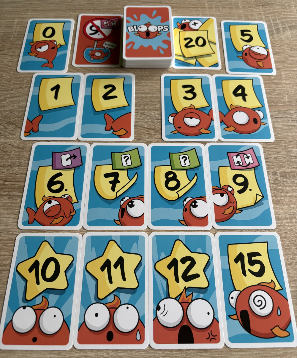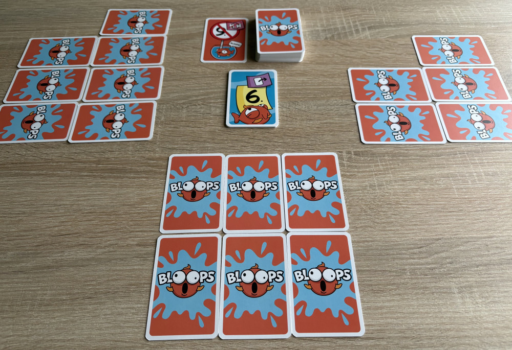 Bloops ist das Kartenspiel, in dem ihr über mehrere Runden hinweg versucht möglichst die wenigsten Punkte am Feld zu haben. Jeweils sechs Karten werden vor jedem Spieler verdeckt aufgebreitet, wobei man sich drei davon ansehen darf und von nun an gut merken muss. Nun wird in jeder Runde eine Karte vom Gesamtstapel gezogen, geheim angesehen und entweder ausgespielt oder mit einer seiner verdeckten Karten ausgetauscht. So läuft das Spiel bis jemand entweder die „20“-Karte ausspielt oder sich die „Bloop“-Karte schnappt und damit das Rundenende einleitet, wer danach die wenigsten Punkte vor sich ausliegen hat gewinnt die Partie.