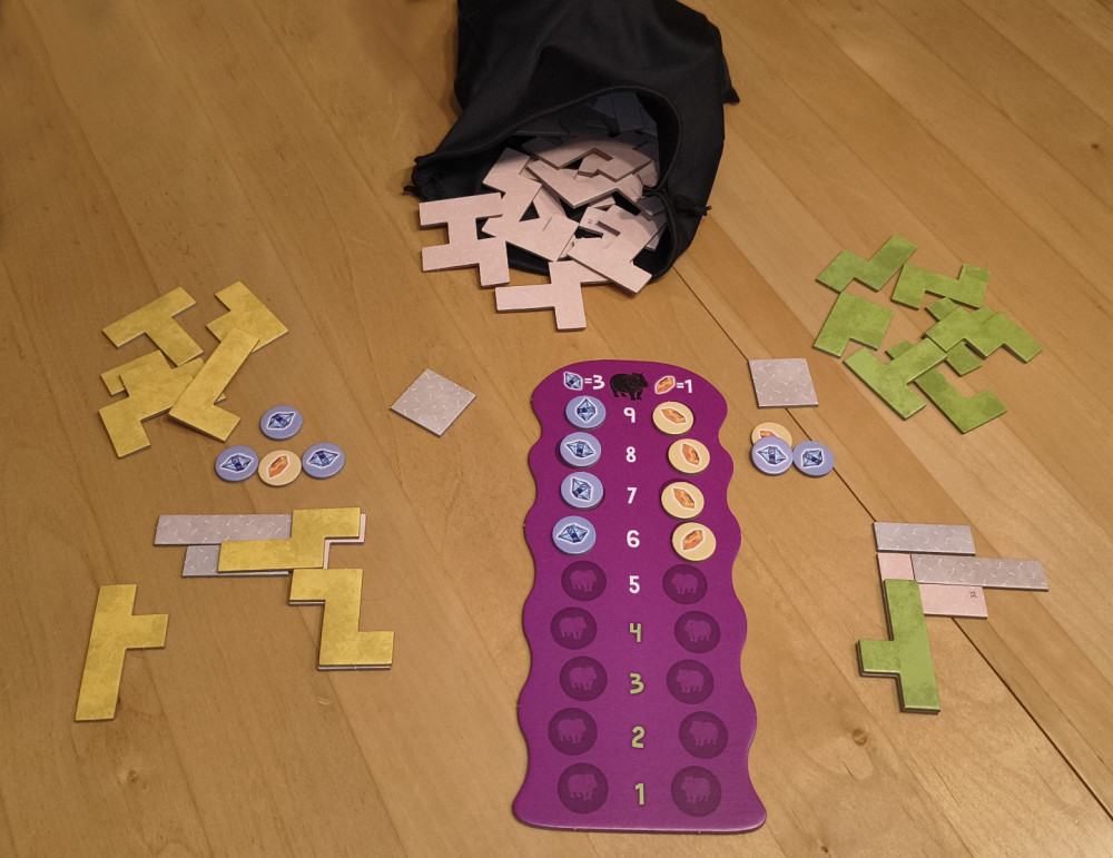 Jeder Spieler nimmt sich ein kleines Start-Basisteil und ein zufälliges Einführungs-Basisteil (jeder zieht eines aus dem Beutel, es gibt unterschiedliche Formen). Wie man diese beiden aneinanderlegt, steht einem frei. Fix ist, dass man die beiden Teile mit zwei seiner Legeteile exakt abdecken muss. Es steht einem aber frei, ob man zuerst die Basisteile zusammenbaut, oder auf ein erstes Basisteil ein Legeteil platziert und dann erst das zweite Basisteil ansetzt (was klar der bessere Weg ist, weil man dann viel besser sieht, welche Formen man bilden kann, die zu meinen Legeteilen passen).