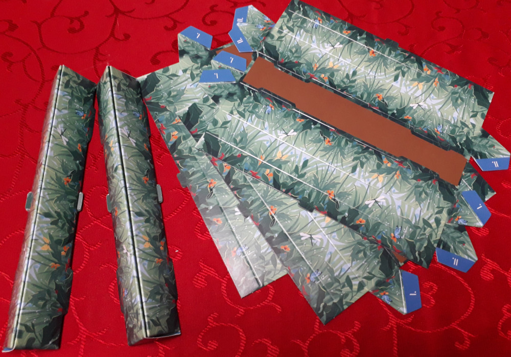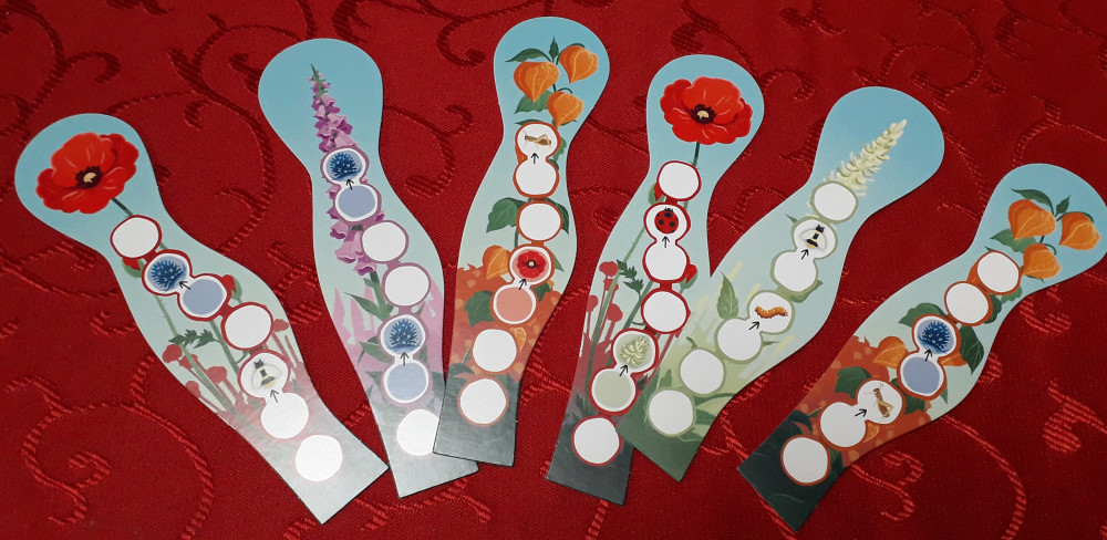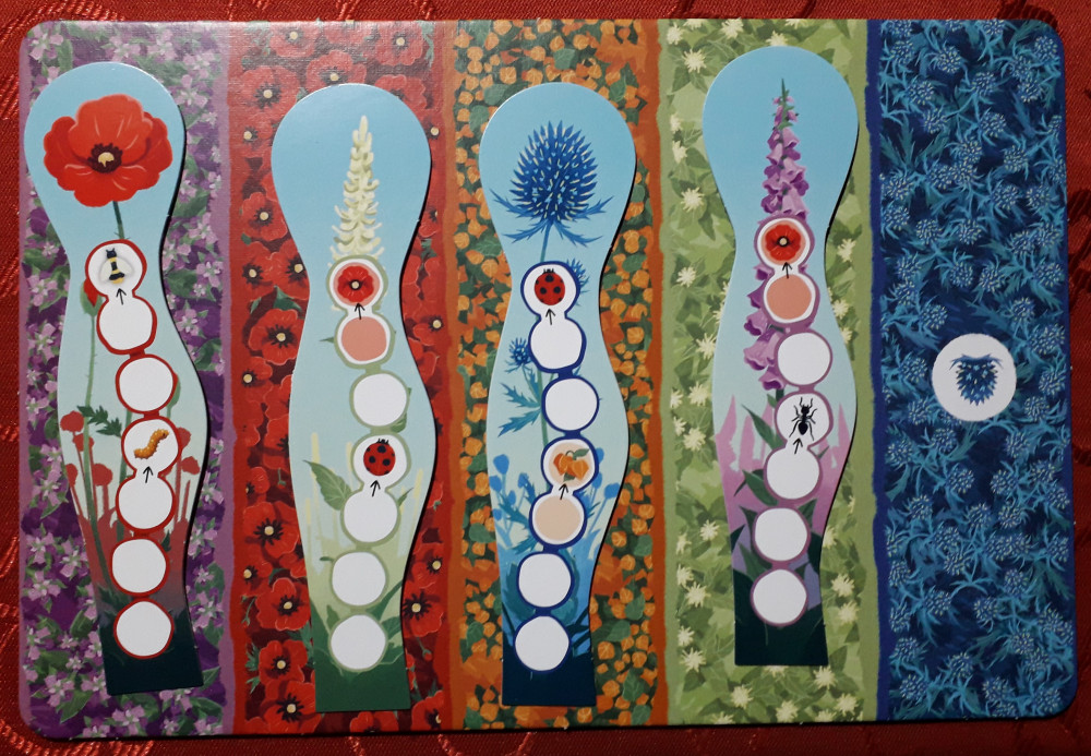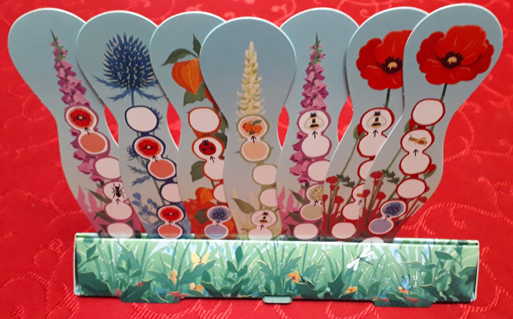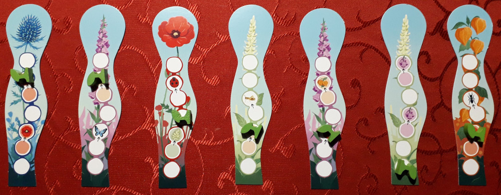 Fertige Blumen - der Same ist oben in der Blüte angelangt - werden in die Aufsteller gestellt und schauen richtig nett aus. Wackelt jemand am Spieltisch, wiegen sie sich sogar wir im Wind. Ein Set im Aufsteller aus allen fünf verschiedenen Blumen wird mit einem Regenbogenplättchen belohnt. Gegen Abgabe in den Vorrat darf dafür ein Same ein beliebiges Feld überspringen.