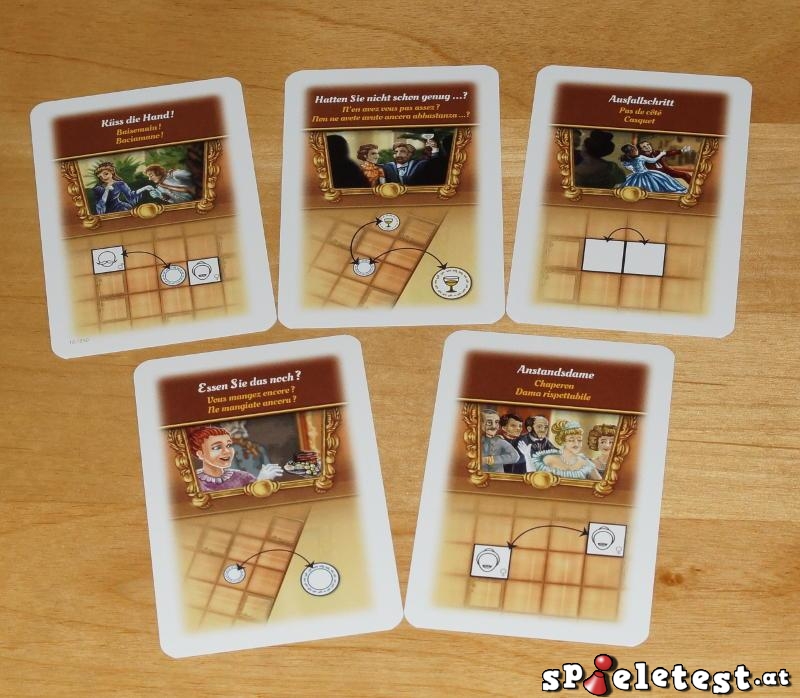 Man hat stets eines seiner Gästekärtchen auf der Hand. Diese zeigen einen Herren oder eine Dame sowie einen Punktewert. Wer an die Reihe kommt, legt dieses Plättchen auf die Tanzfläche. Man nimmt sich das Buffetplättchen, das dort gelegen hat. Die Buffetplättchen zeigen eine von fünf Köstlichkeiten in einer Anzahl von ein bis drei Stück oder ein Champagnerglas.