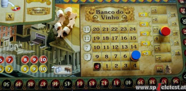 Wie ich bereits zu Beginn meiner Rezi geschrieben habe, ist Vinhos ein sehr komplexes Brettspiel, dessen Mechanismen eng miteinander verzahnt sind und die nicht gleich im ersten Spiel alle sofort präsent sind. Man benötigt da schon ein paar Partien, um alle taktischen Möglichkeiten überhaupt fassen zu können. Etwas gewöhnungsbedürftig war für mich die Abhandlung in der „Banco do Vinho“ mit dem Konto und der Investitionsleiste. Die Weinausstellung kann durchaus als Spiel im Spiel bezeichnet werden, nicht nur wegen der eigenen Punkteleiste. Die Inanspruchnahme der Manager sollte keinesfalls vernachlässigt werden, denn hier können sich die Spieler selbst mit billigem Wein große Vorteile verschaffen. Da diese oftmals erst zum Schluss wirklich zum Tragen kommen, ist schon so manche Partie hier entschieden worden.