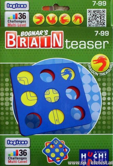 Bei Bognar´s Brain Teaser: Dragon Treasure handelt es sich um ein Logikspiel. Acht kleine Platten stecken in zwei Gittern, die sich gegeneinader verdrehen lassen. Wer kann die Platten so arrangieren, dass sich ein sicherer Weg zum Schatz ergibt?
