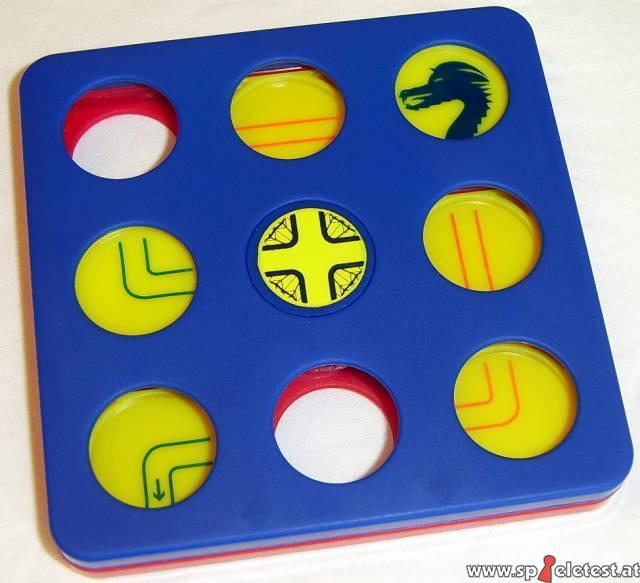 Der Brain Teaser würde nicht Dragon Treasure als Untertitel tragen, wären nicht Drachen und Schatz ein elementarer Bestandteil des Spiels. Zwei Drachen gibt es, einen auf der blauen und einen auf der roten Seite des Spielmoduls. Die beiden Seiten des Moduls können gegeneinander verdreht werden, als Achse dient das zentrale Feld - die Schatzkammer. Die Platten können an manchen Positionen (jede an anderen) die Ebene wechseln, wobei sie in der einen Ebene eine Drehung mitmachen und in der anderen an ihrem Ort bleiben.