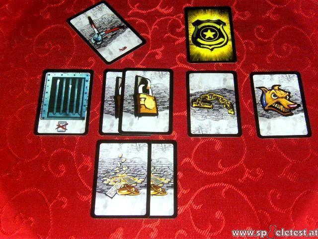 Die Zuteilung der Karten erfolgt auf sehr einfache Art und Weise. Der aktive Spieler zieht so viele Karten vom gut gemischten und verdeckten Zugstapel wie Spieler (noch) mit dabei sind und teilt jedem Spieler genau eine Karte zu. Aber: Die Karten werden einzeln gezogen und zugeteilt. Damit entsteht ganz automatisch das Dilemma wem welche Karte geschenkt werden soll und welche man sich selbst nimmt. Taucht gleich zu Beginn der Zugphase eine gute Karte auf, etwa eine Knochenkarte die einen Hund neutralisiert oder ein Bolzenschneider der die Kette entfernt, fällt die Entscheidung nicht so schwer. Schwer wird sie hingegen wenn die ersten Karten schlecht sind. Dann gilt es Nerven zu bewahren und ein glückliches Händchen beim Aufdecken der Karten zu haben. Aber natürlich kann es schon passieren, dass man sich selbst an den Rand der polizeilichen Festnahme zu bringen gezwungen ist. Wie erwähnt kann der Anwalt mit seinem Wissen um Recht und Gesetz den einmaligen Aufschub der Verhaftung erzwingen. Eine zugeteilte Karte darf mit dem Rechtsverdreher abgelehnt werden.