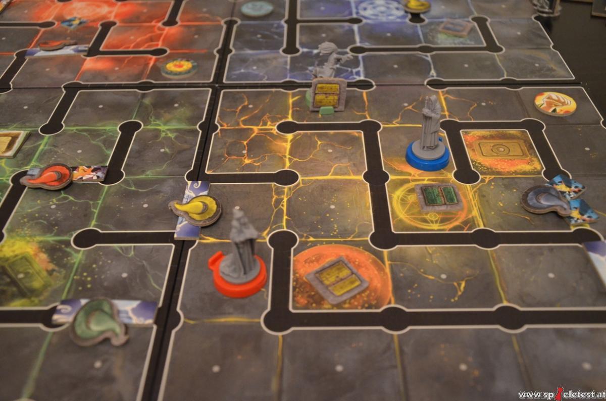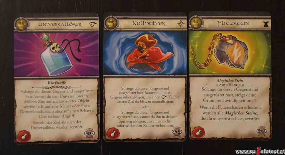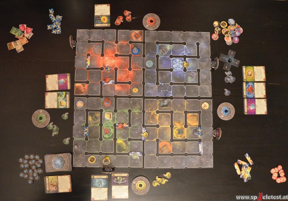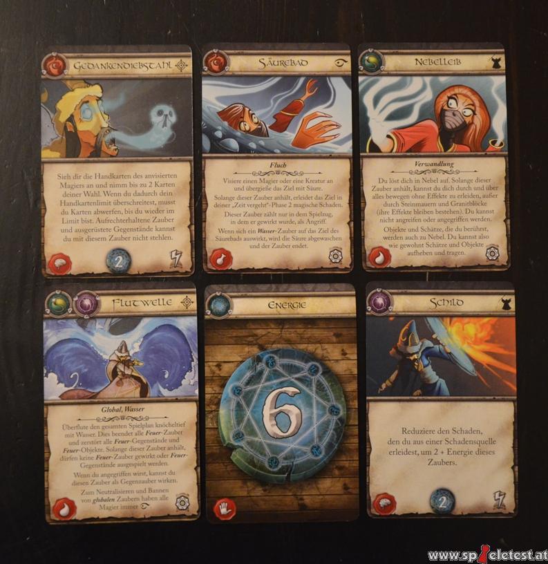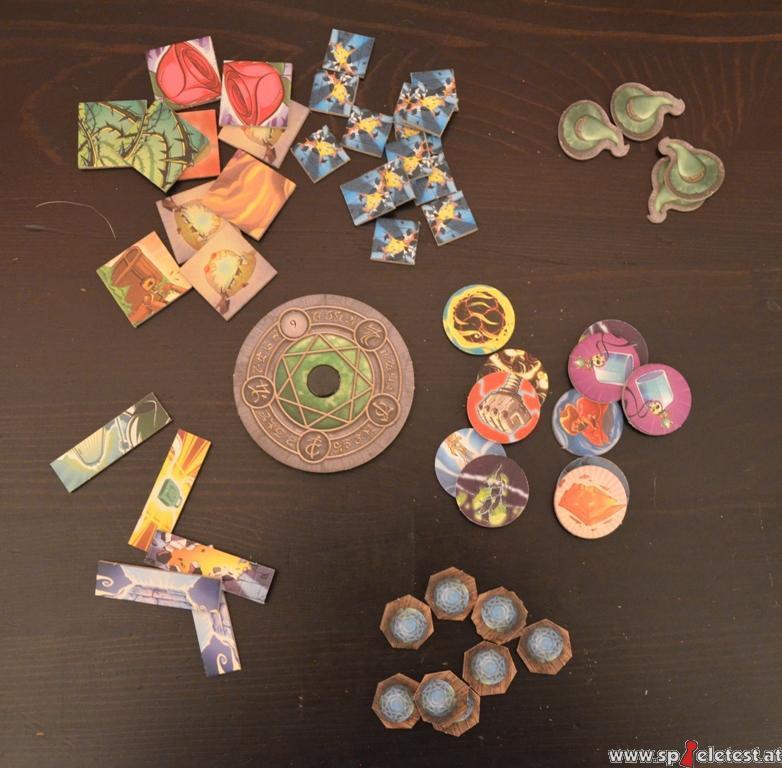 1 Regelheft 4 Spielplanteile 4 Magierfiguren aus Plastik 4 Plastikstandfüße für die Figuren (1 pro Spielerfarbe) 5 Figuren für verwandelte Magier 4 Lebensräder (1 pro Spielerfarbe, jedes Rad besteht aus 1 Deckscheibe, 1 Ziffernblatt und 1 Plastikverbindung) 1 Schablone für zufällige Richtungsbestimmung 168 Magiekarten (24 pro Magieschule) 1 Vierseitiger Würfel 4 Plastikstandfüße für die Portale 139 Pappteile, bestehend aus: 47 Objektmarker 4 Portalmarker 8 Schatzmarker (2 pro Spielerfarbe) 20 Breschenmarker 26 Energiemarker 24 Hutmarker (6 pro Spielerfarbe) 10 Betäubungsmarker