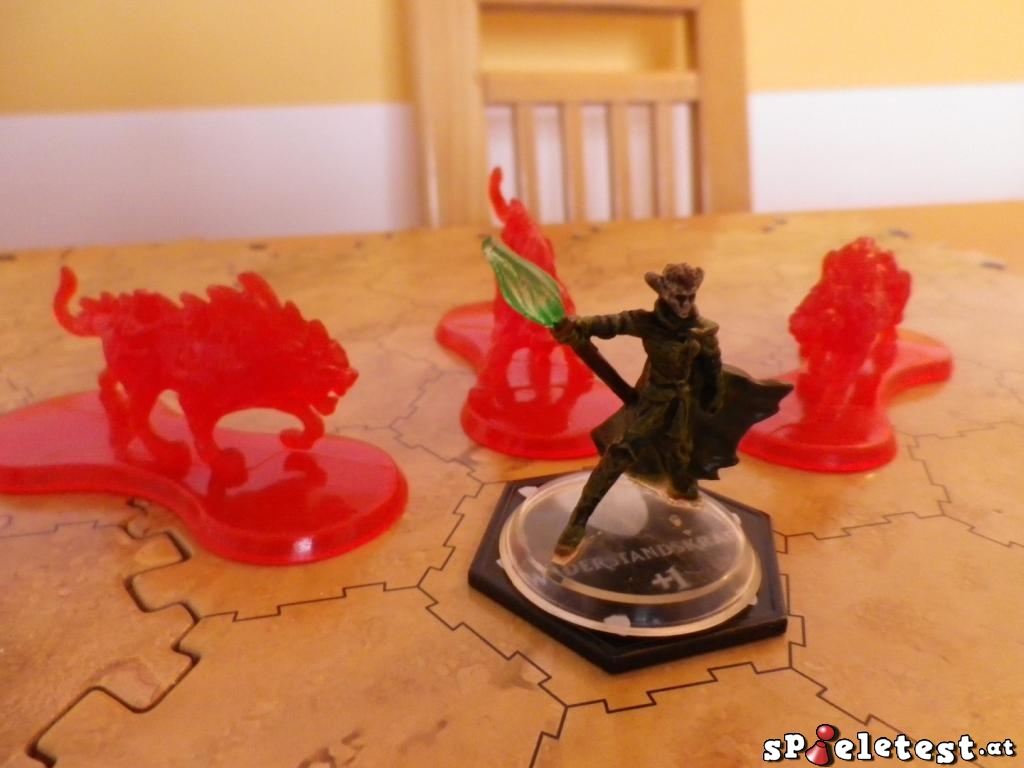 Eine Attacke läuft grundsätzlich sehr simpel ab: Angriffswürfel gegen Verteidigungswürfel, die Differenz macht den Schaden aus. Ein Nahkampfangriff wäre damit schon abgehandelt (man muss nur etwaige Karteneffekte einrechnen). Einen besonderen Kniff haben sich die Entwickler aber für die Line of Sight einfallen lassen, die für den Fernkampf notwendig ist. Hierfür werden jetzt die eben erwähnten Trefferzonen interessant. Auf jeder Karte findet sich eine Grafik, die die Miniaturen abbildet. Auf der können wir ablesen, welcher Part der Miniatur angreifbar ist und welcher nicht. Weiters ist auf der Grafik ein roter Punkt dort eingezeichnet, wo sich die Augen der entsprechenden Kreatur befinden. Damit eine klare Line of Sight besteht, muss man nun von diesem roten Punkt eine Linie zu einem beliebigen Punkt der angreifbaren Fläche des Zielcharakters ziehen können. In der Theorie gefällt uns diese Idee sehr. In der Praxis ist die Regel allerdings beinahe schon obsolet, da diese Linie nur dann nicht gezogen werden kann, wenn die Kreatur ohnehin ganz eindeutig nicht sichtbar ist. Schade, aber sehr guter Einfall!