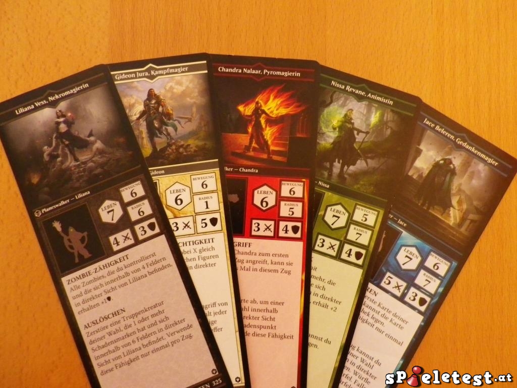 Steht die Spielfläche oder besser: die Arena, kann der Spaß im Grunde beginnen. Wir brauchen nur noch unser Arsenal. Dazu wählt jeder eine Farbe und erhält damit auch alle mit dieser Farbe assoziierten Karten und Miniaturen: Truppen schwächerer Einheiten (wichtig: Jeder Trupp wird durch EINE Karte repräsentiert), aber auch einen mächtigen Planeswalker und seine Zaubersprüche. In künftigen Editionen sollen (wie man es vom Kartenspiel kennt) auch Ausrüstungen und Artefakte hinzukommen, im Grundspiel müssen wir mit Hexereien und Auren, also Verzauberungen, vorlieb nehmen. Mit ausreichend zusätzlichem Kartenmaterial aus Erweiterungen wird es dann möglich sein, sich seine Armee mittels Punktevorrat selbst zusammenzustellen – auch auf dieses Feature müssen wir aber vorerst verzichten. Jeder der bis zu fünf Planeswalker wird auf einen der vordefinierten Startpunkte gestellt, der Rest bleibt für jetzt vor uns liegen und die Schlacht beginnt.