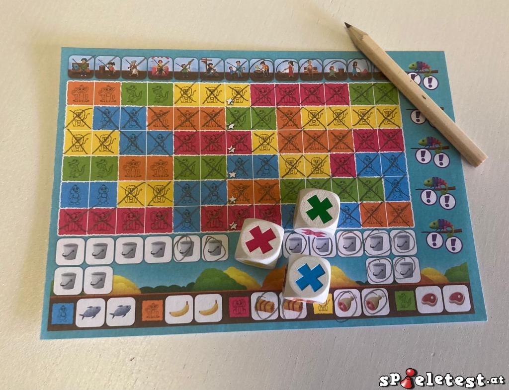 Sollte man mal nichts passendes ankreuzen können, kann man mit einem lilanen Würfel einen Teil eines Chamäleons ankreuzen. Mit zwei Kreuzen zieht das Chamäleon in ein Gehege ein und man darf ein beliebiges leeres Gehege ankreuzen.