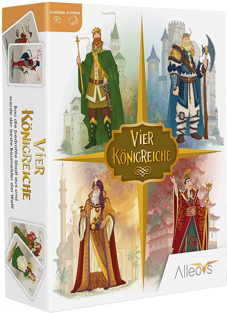 Das Königreich der Sonne, der Bergländer, der Waldvölker und das Wüstenreich sind die Namengebenden Vier Königreiche. Jedes Königreich besteht aus 9 Karten. Alle Karten werden unter den Mitspielenden verteilt und alle erhalten 7 Münzen aus dem Münzvorrat. Die restlichen Münzen (je nach Teilnehmendenzahl) werden als Staatskassa auf dem Tisch bereitgelegt. Ziel ist es, die Baukarten auf der Hand möglichst schnell loszuwerden und dafür möglichst viele Münzen zu verdienen.