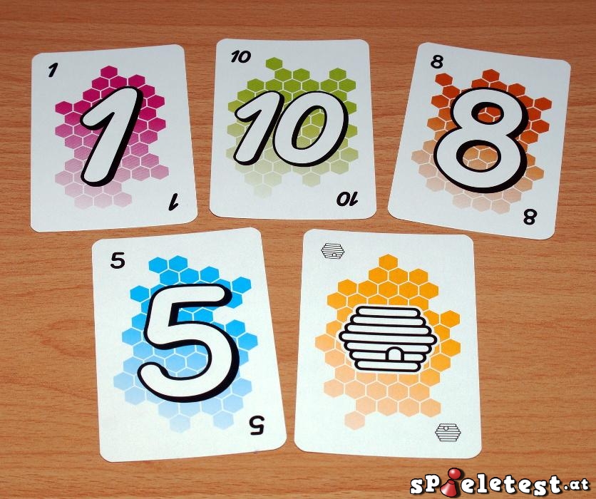 Es gibt Karten in den Werten von 1 bis 10. Es gibt Karten in unterschiedlichen Farben, was für das Spiel aber keine Bewandtnis hat. Weiters gibt es Sonderkarten, die z.B. das Anschauen von sonst nicht einsehbaren Karten erlauben. Die Sonderkarten haben Wert 0 oder 20, je nachdem welche es ist.